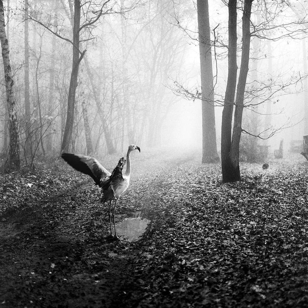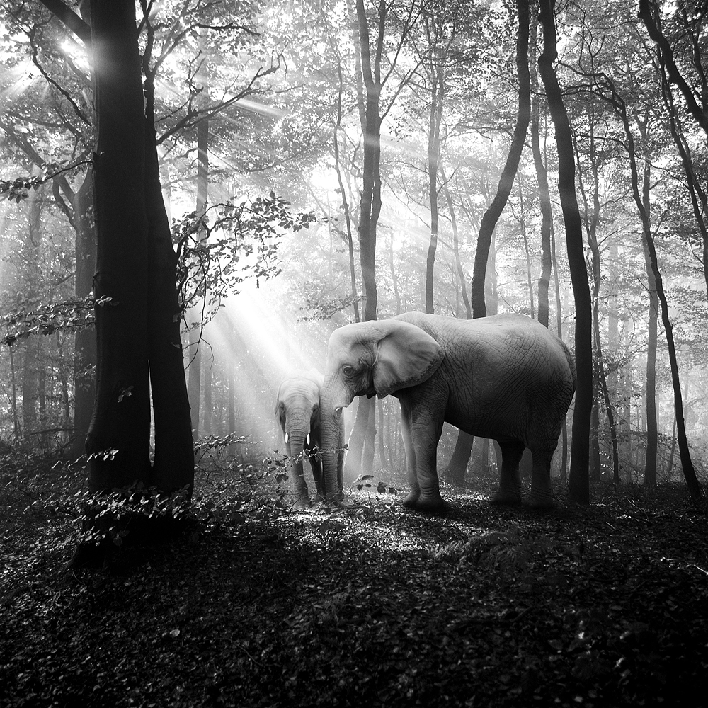 tierwald- by Frank Machalowski Is this fiction or reality? This is the question underlying the series – the images provoke the viewer question what they see. Is this a picture of a warm rain forest or a cold German mixed forest? Is this rhino really living in this forest or is it a giant zoo? The images in the series are in fact produced by combing two photographs – one taken in a forest and one taken at a zoo. I was photographing deer in a forest in Germany when I had the idea of simulating the image with a more exotic species, and this led to the series. The forest in this picture is the famous 'Teutoburger Wald' in the middle of Germany and the rhino is from Berlin Zoo. The animal photographs are mostly digital and the photographs of the forests are all analogue, taken on a medium format 6x6 camera, which are developed using traditional chemical processing before scanning the negatives.