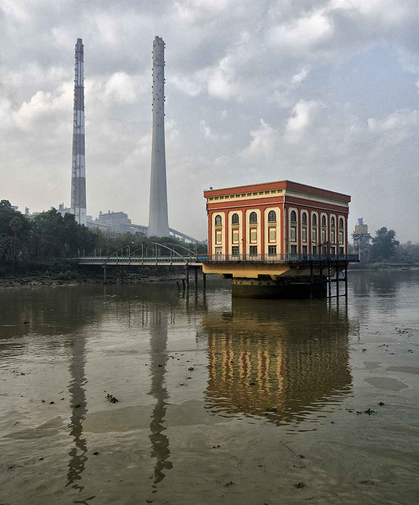 Juxtaposition of a colonial built water intact and new power station on the Hooghly River in Bengal in India