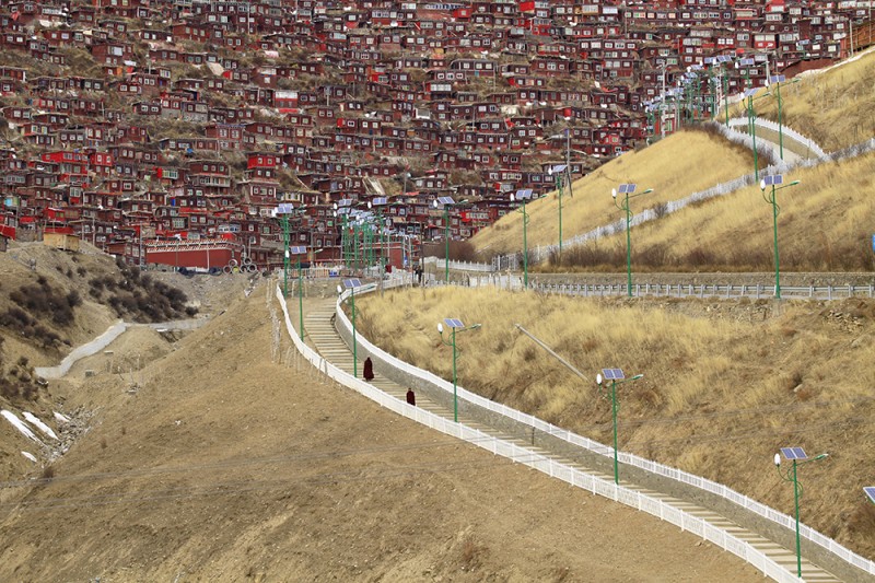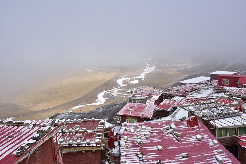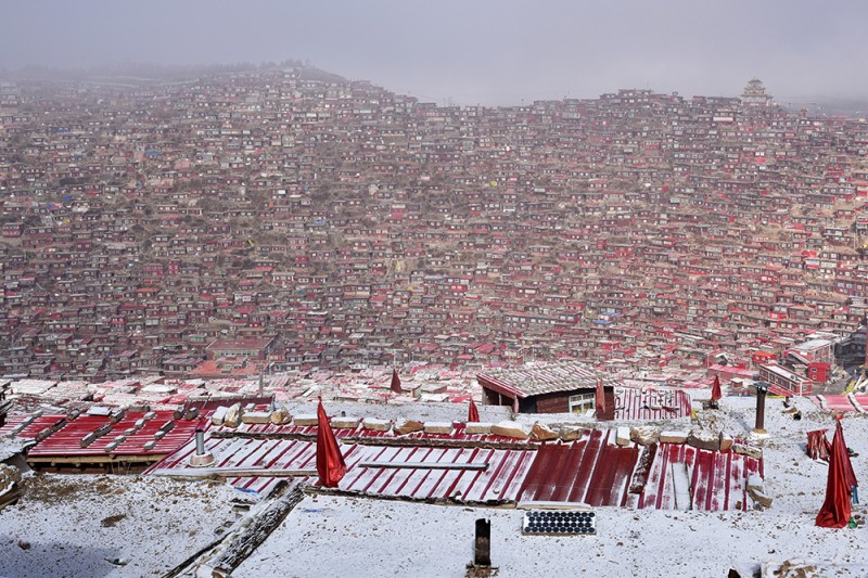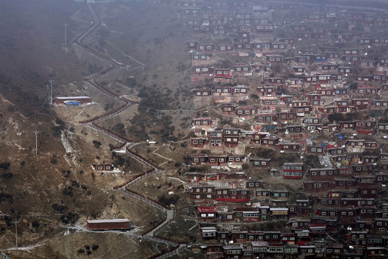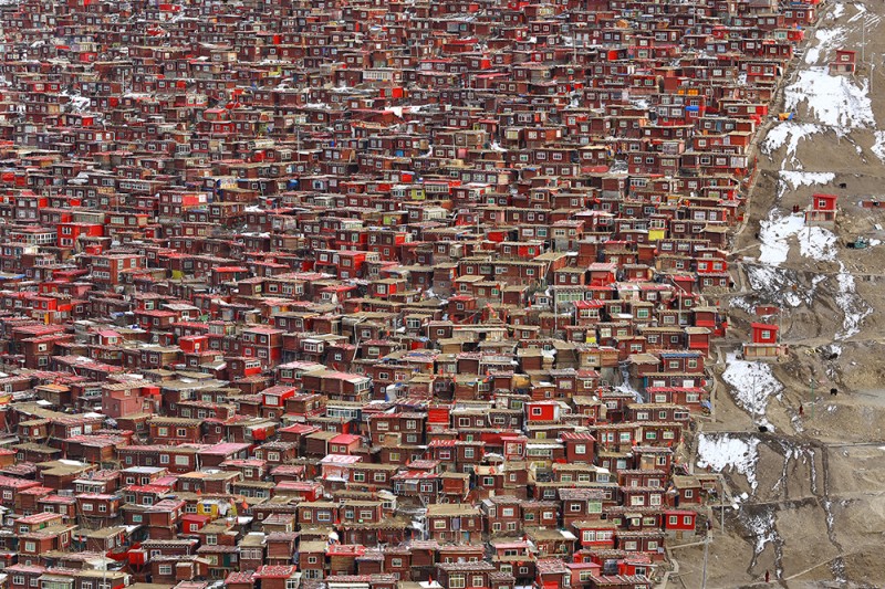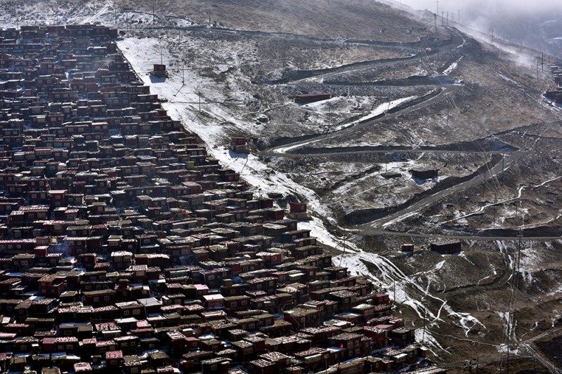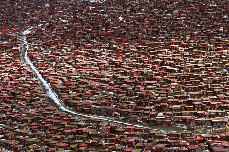 The Holy cultural settlement at She Da, China, for Tibetan Buddhism continue to grow and extend its housing for Tibetan Buddhists who wishes to devote themselves to the religious study. The captured image reflecting an ongoing construction, a dense yet congested red and rhythmic pattern of the Buddhism sanctuary.
