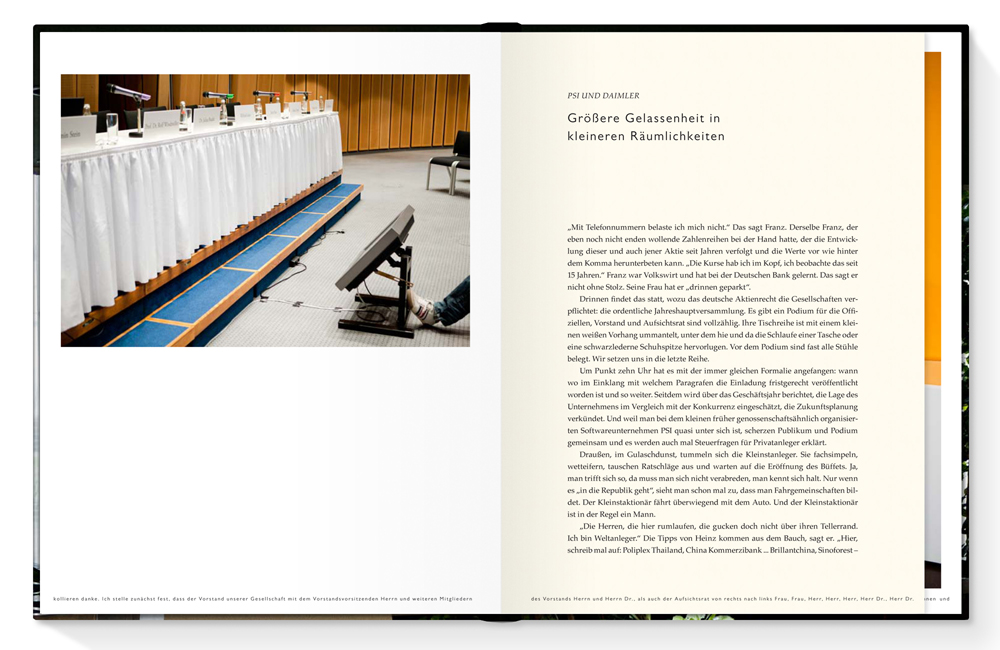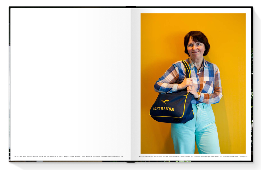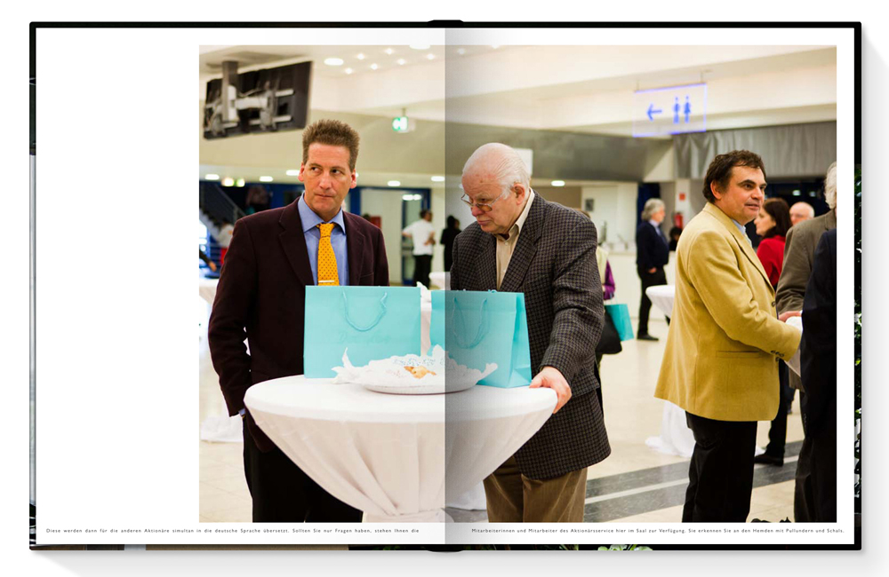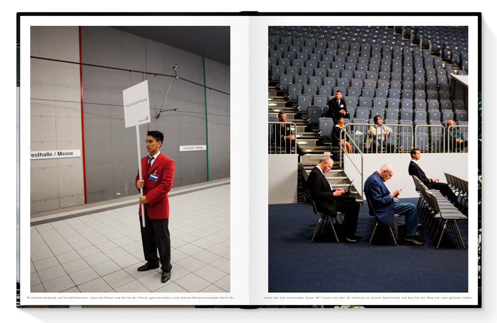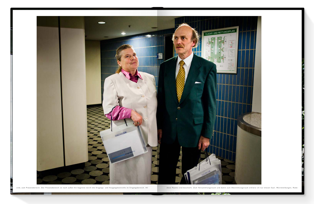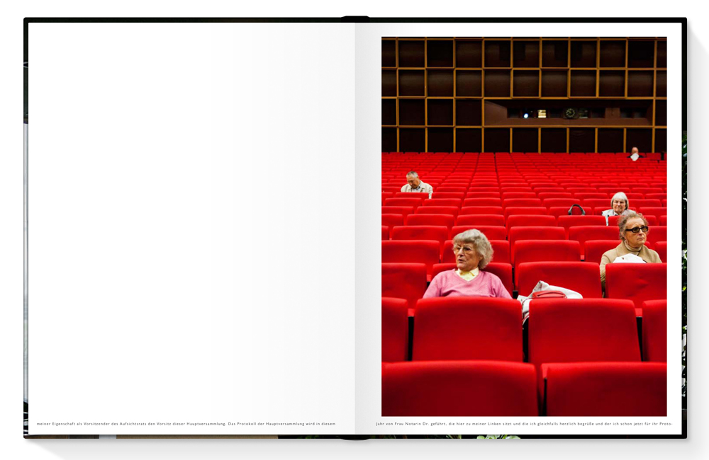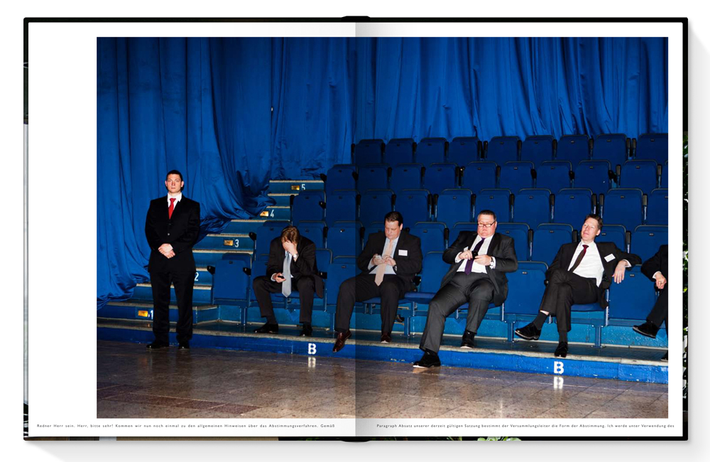 Shares are the ticket to a microcosm, where power and money meet the hopes and desires of ordinary people. A rip-off_ mentality dominates both on stage and in the auditorium. However there is also tradition, dedication and fan-like devotion. The annual general meeting of shareholders is open to everyone, yet unkown to most. In theory, it is about every single share, in practice it is the international major shareholders that rule the decisions, and these shareholders are not so much real people, rather they are economic legal entities. This world, this parallel existence is a grass-roots democracy only in principle, and it is all about appearance. What is left for the minor shareholder is the stage, attention – a currency that seems more valuable to some than power and money. For more than a year I visited the AGMs of large and small German stock corporations and mingled with the visitors there. Together with Nadine Schmid's text reportages the work has been published as a book in 2016.