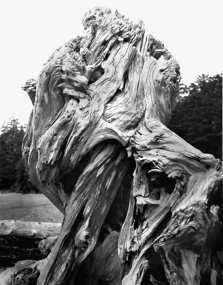 A human praying form along with other coastal marine life can be seen amalgamated into a single root of an ancient cedar found along the shoreline of Pacific Rim National Park.