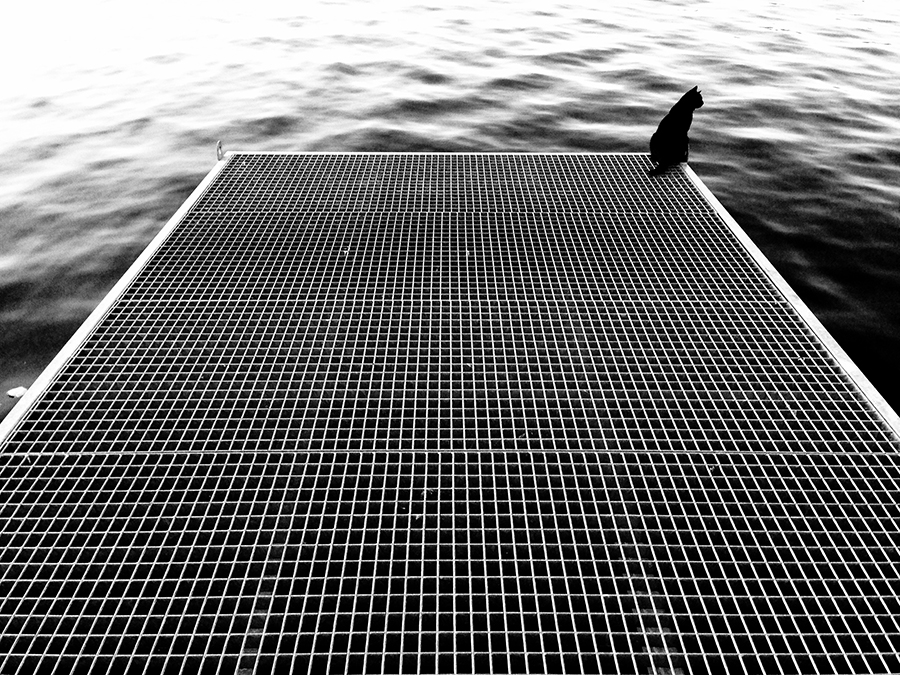 Cat sitting on the water ramo for the boats, seems to be "top of the building".