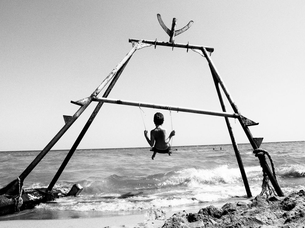 Place: Beach of Noto, near Siracusa (Sicily - Italy). A happy child is playing on a swing hung by unaware bathers on the remains of an immigrants' boat. The vessel ran aground and then was slowly swallowed by the wet sand of the shore, to the point of leaving only the top metal structure exposed, making it unrecognizable to beach goers. The ongoing European migrant crisis is causing a rising number of refugees and migrants to make the journey to the European Union to seek asylum. They travel across the Mediterranean Sea or through Southeast Europe on small unseaworthy boats which often cause their death.