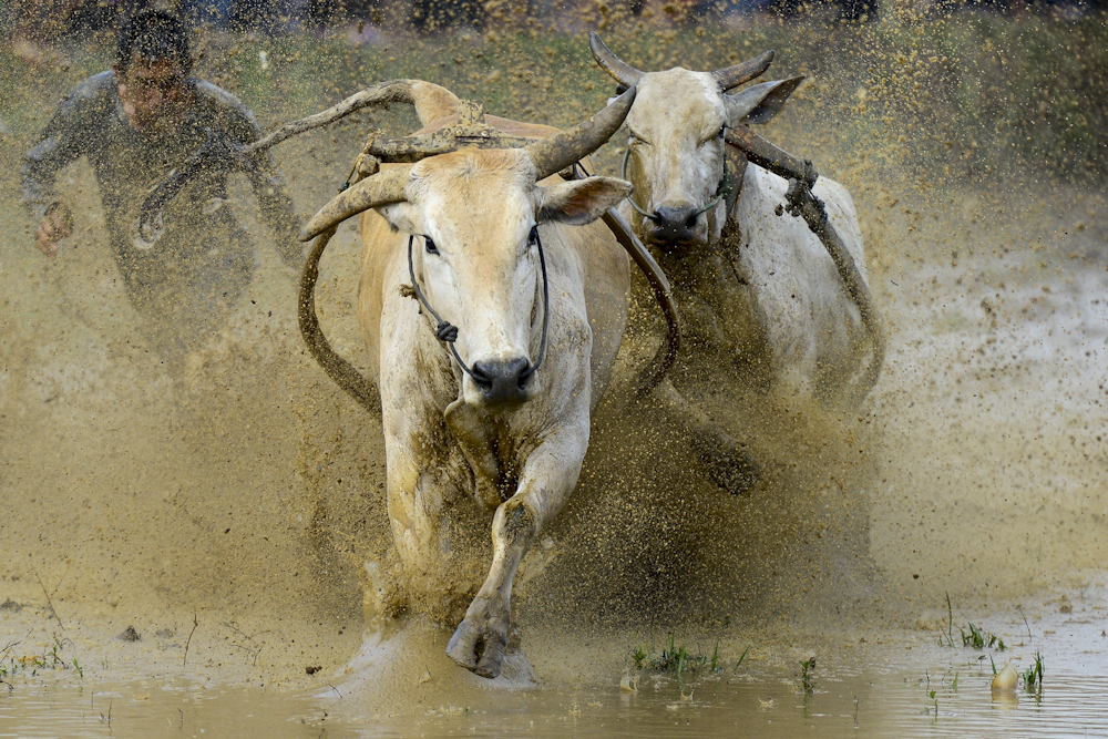 Runaway. Traditional race of oxen in the rice paddies of Sumatra Island. Indonesia.