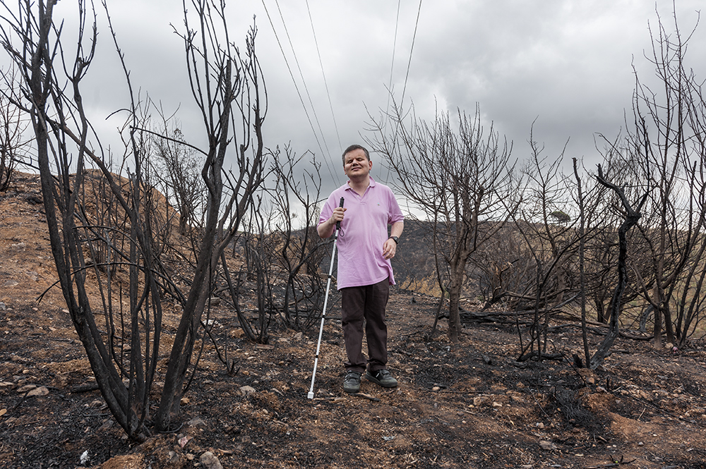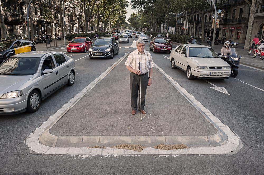 We all talk about things we have never seen or experienced but we know through what we have been told, things that are hidden to our senses but we believe they exist. Similarly, a blind person knows the colors despite never has seen them. Blind Colors revolves around one question: How does someone blind from birth interpret the colors? After having conducted a series of interviews in which the blind were asked about the feelings they have when speaking of colors, we looked for spaces or places that describe the color explained by each of them. In the majority of cases that color does not exist in the photographed scene. And normally does not exist because their color interpretation does not correspond with the way of life of people who can see. It is based on another type of perceptions, whether through the other senses or of definitions and sensations that they have been or lived. The color range is transformed in this way in a range of experiences that allow communication between the blind and the sighted, in a world where the color has a fundamental importance. "For living is not necessary to see, just feel." Alberto Guinea, project participant. Photo 01 THE BLACK Xavi Piñol, cemetery of Les Corts. October 29th, 2014 Xavi describes me the black color. The black of death, not just associated with mourning but rather with the "fade to black" used in film. Everything goes out, everything ends. The senses fail. I have never seen –he explains me-, but my ears, my touch, my taste and smell gradually will become dark, arriving to black. Photo 02 THE NO COLOR Paquita Garcia, Joan Pelegrà school pool, Barcelona. November 5th, 2014 Paquita does not relate colors with anything. In her imaginary color just does not exist. She tells me that the color is the skin of things and for her the things don’t have fur. She feels the color like an unnecessary accessory in life. The water represents for her a colorless world. "If you don’t have wings you can’t fly" Photo 03 THE BLUE Alberto Guinea, Rialb marsh. November 16th, 2014 Alberto links blue to loneliness, sad, melancholic people. He associate it with the term "Blues" which designates the musical genre. A landscape of desolation surrounds Alberto blue and makes you ponder a dubious present. Photo 04 THE YELLOW Marc Sarrato, Sant Andreu de la Barca. February 22th, 2015 "The yellow is dirt, I get it like if the white purity and cleanliness have been corrupted. With time and use things become yellow. It is an unpleasant color, I associate it to rubbish tips and chaotic places full of crap." Photo 05 THE BLACK Francisco Javier Cebollero, Cami de cal Notari, Collserola mountain, Barcelona, July 25th, 2015 The desolation and sadness which causes a burning forest represents the black color for Francisco Javier. A black dyeing of absence, something that once was but no longer is. Photo 06 THE PURPLE MarÃa Pérez, L'Ametlla de Mar, September 11, 2015 An abandoned playground symbolizes the color purple for MarÃa. It is the memory of a past full of happiness in which no one made her feel different. When she was a child, some dressmakers used to give her some purple coloured clothes just for she could play. She used them to dress her dolls, and that color became the color of her childhood, the games, the swings and snacks of bread and chocolate in the Park. Photo 07 THE GREY Tubau Vicenç, Gran Via de les Corts Catalanes, Barcelona, May 22th, 2015 Traffic noise is like a grey fog, thick, leaving not hear clearly Vicenç. The more noise, the more dark becomes and Vicenç gets more disoriented. Grey is an annoying noise. Photo 08 THE PINK LluÃs Vilà , Gran Teatre del Liceu. Barcelona, November 18th, 2015 A goal of his football team, good meals and music, especially music, are pink for LluÃs. The Gran Teatre del Liceu surround LluÃs in pink because this color moves him to moments of happiness and everything that makes enjoy.
