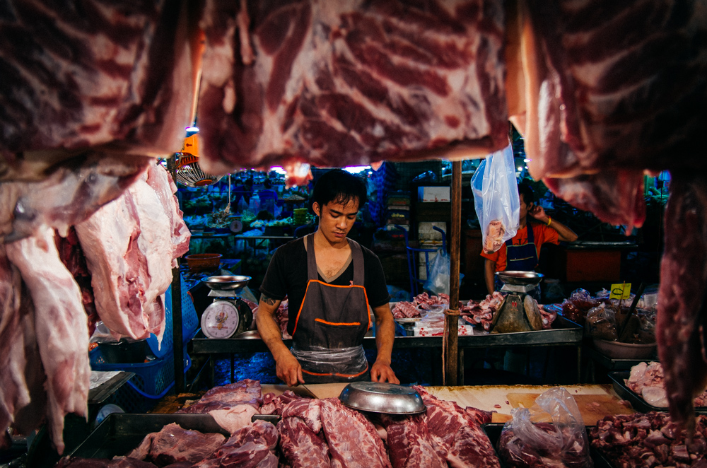 The consumption of meat is growing years after years, but it could be interesting observe if a visit to Khlong Toey market would change this statistic. The Night market of fresh meat in Bangkok is a nightmare of scents and visual images, the street alleyways resembles an hell in the world instead of a peaceful market, and the chicken sing the last song before being cooked.