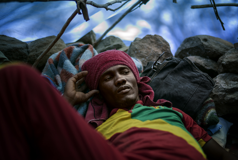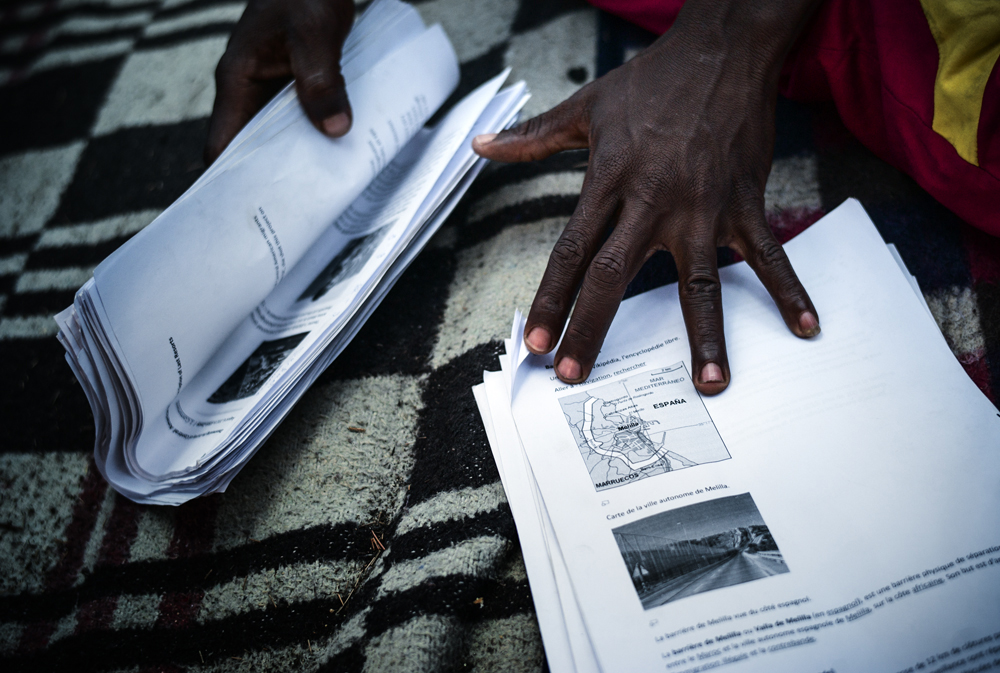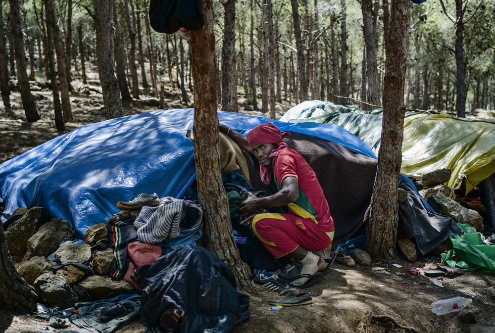 Every day hundreds of immigrants mainly from sub-Saharan Africa, survive in harsh conditions, hidden away in improvised camps of plastic, camouflaging in the beautiful natural environment of pine forest and rocks of Mount Gourougou, trying to avoid being located by Moroccan security forces, and try to circumvent the three consecutive metal barriers of about five km. in length and over eight meters high, equiped with concertina wire with -knives sharp-, separating and hinder the ultimate goal of achieving the European border city of Melilla, to comply with the dream and the right of every human being in pursuit of a dignified life, egalitarian and freedom of movement.