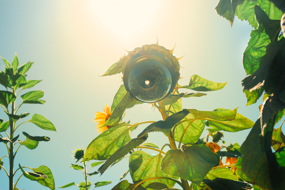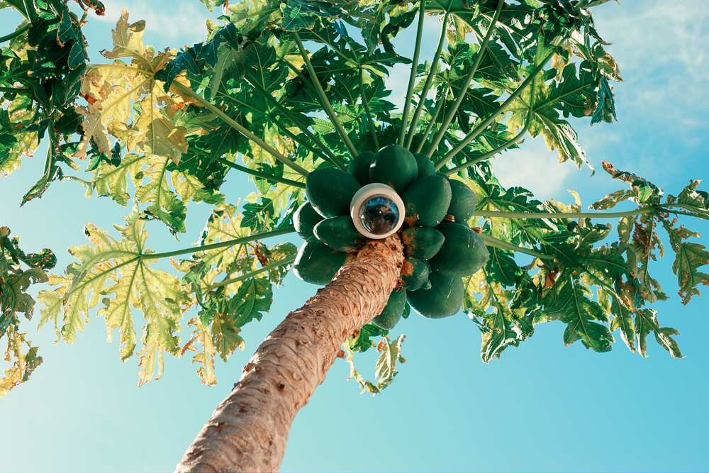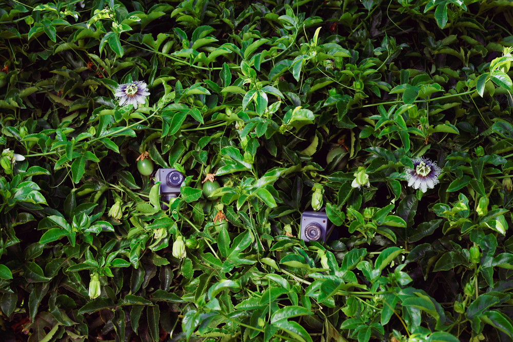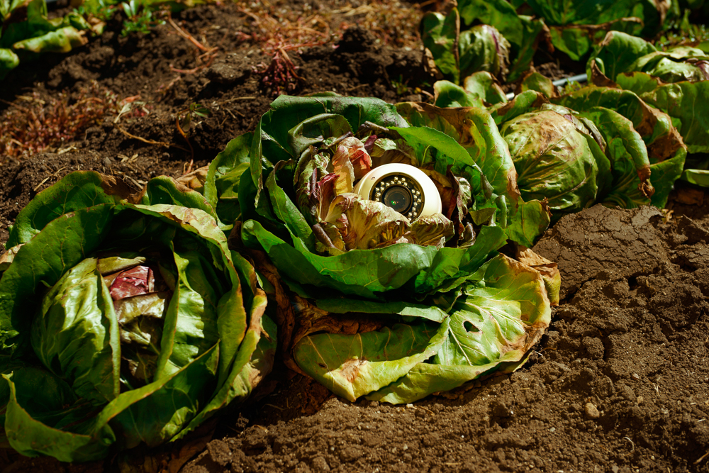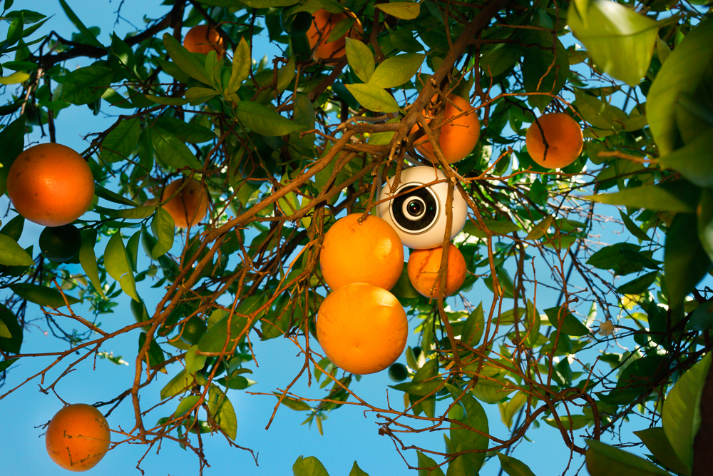 From superposing those equiformal surveillance cameras and plants, I use my photographs to blend my memories of different ages and environments. Surveillance cameras are the emblem of uncomfortable urban experiences. By way of contrast, bright-colored orchard scenes are the emblem of my happy childhood time. I always struggled between our functional technologies and organic environments. Some people say our ideal life should be pure, simple, and organic - just like yesterday. Yet, our pioneers of science, society, economy, and many other fields greatly strive to make our life safer and more efficient, namely through surveillance systems. Thanks to them, our neighborhoods are safer than ever; however, something also has changed – the feeling. I remember when I was a child, except for several residential areas and research facilities, my home town has a vast territory of farmland and wild land. The best time was summer. I could run in the rural orchard and farmland and have the place almost to myself. Only plants and animals could hear and see me. Before long, my family moved to the city. Now and then, I would inadvertently find surveillance cameras rotating among an empty nature park. It was then I suddenly realized someone was always watching me in every corner. I felt that the fully relaxed feeling would never return as I walked in the city.