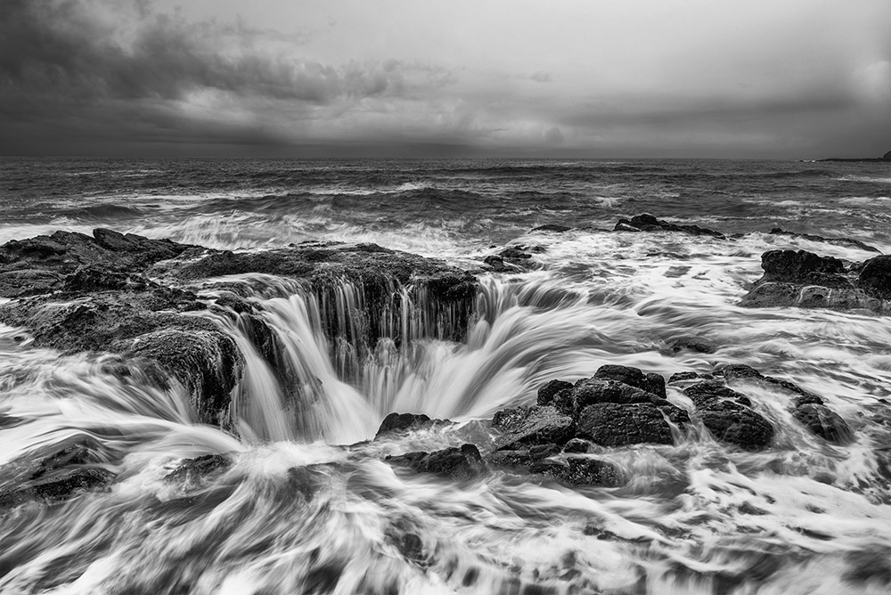 Rough waters sweeping over the coast of Oregon at Cape Perpetua. The water violently funnels into a collapsed cavern, perfectly illustrating and foreshadowing the imminent danger from the incoming storm on the horizon.