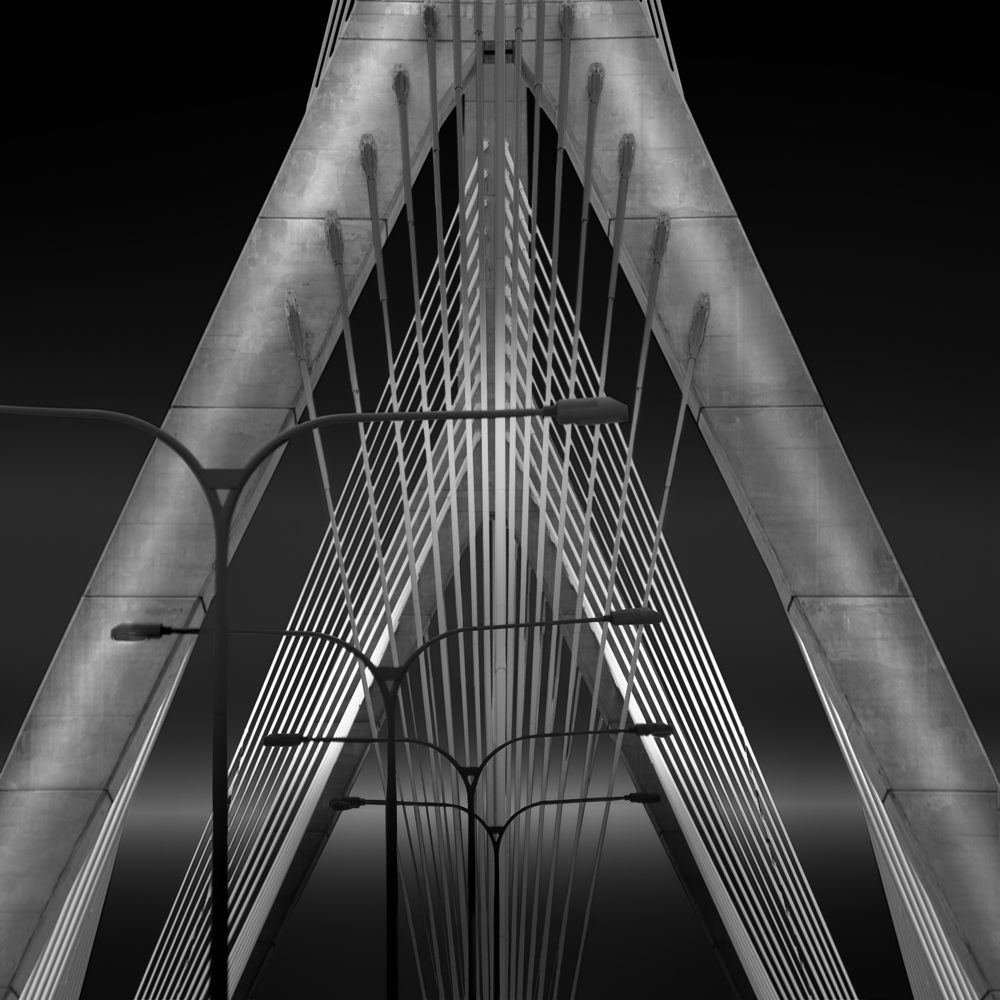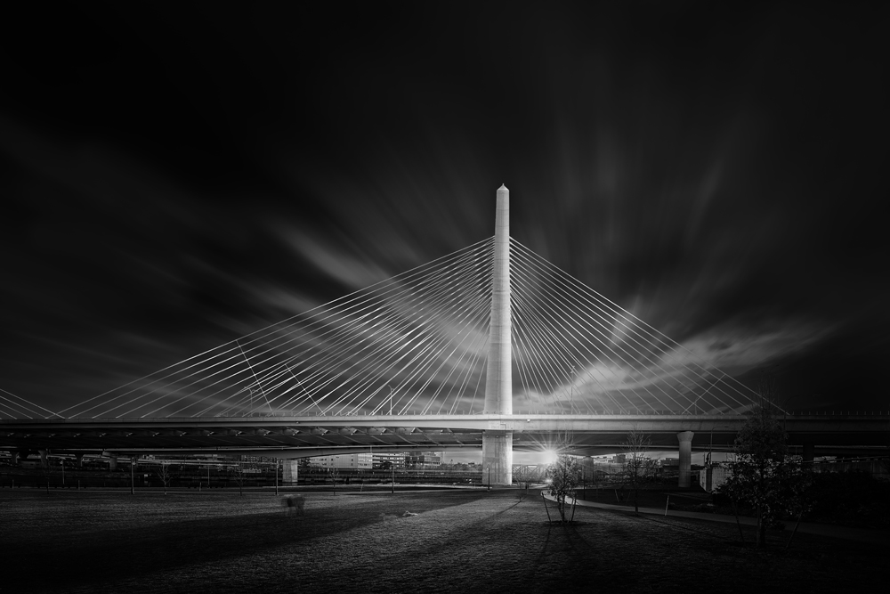 Zakim Memorial Bridge in Boston is unique from each perspective. First is a beautiful cable bridge over the river in it's elegance. Second is the abstract geometry with the cables' and pylons' interplay. Third shows the bridge as memorial-obelisk. Time passes. Architecture stands. The black and white expression I couple with long exposures give me an opportunity to show the continuum of time, a slice of it in which the art of architecture lives.