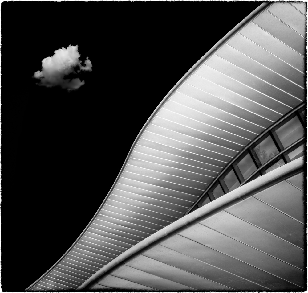 Cohen Performing Arts Center, California Polytechnic State University, USA. This is a composite image. Since there were not any clouds I had to add a cloud as a homage to Cole Thompson. I also darken the sky. The building was captured in HDr using 7 exposures. PhotoMatix was used for combining and tonemapping. CS5 and SilverEfexPro2.