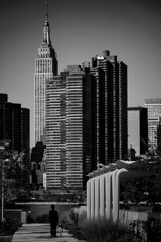 Woman walking her dog in Queens, with Empire State and other Manhattan buildings view in front. New York City.