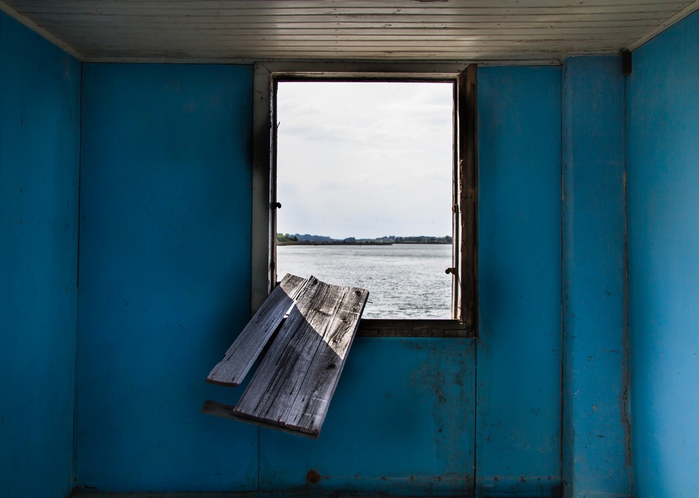 A forsaken little house at the foot of a lagoon, getting soaked by the rising water. Deserted and condemned.
