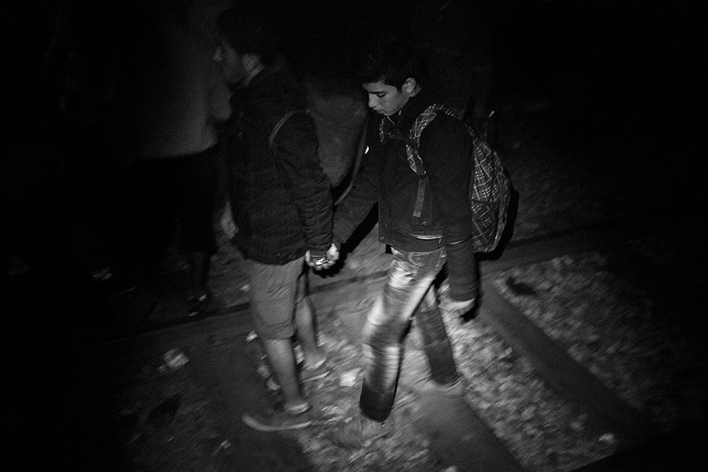 Two young syrian boys hold hands while walking in the dark, along the railway, near the village of Röszke, Hungary. In september 2015 a huge number of refugees crossed the Serbia-Hungary border escaping the war-torn countries of Syria, Afghanistan and Iraq. Thousands of people were trying to cross at night, to avoid registration in Hungary and continue secretly to the countries of northern Europe. Three days later Hungary will seal the border with Serbia with a razor wire fence.