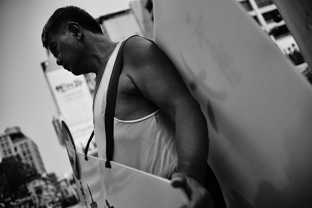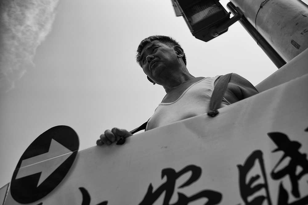 Placards man, 53 year old Mr.Wu Housing advertising placards work on Saturday and Sunday 10:00 to 18:00 daily wage of $ 28 an hour break for 10 minutes, 1 hour lunch. Placards have been working for nine years! Movin ⋯