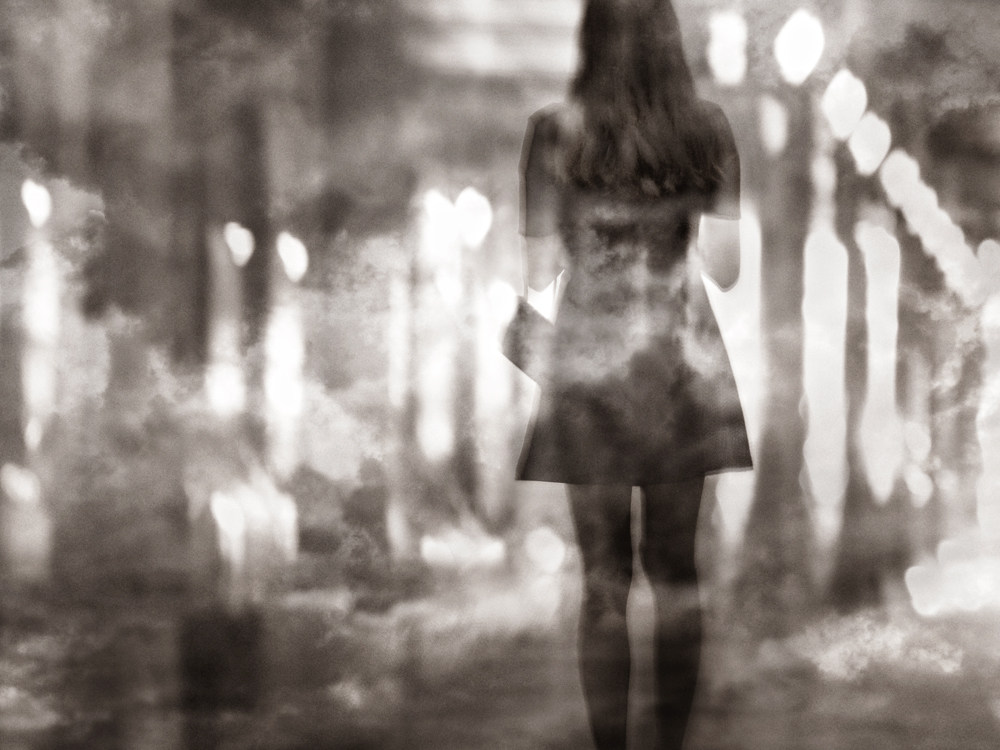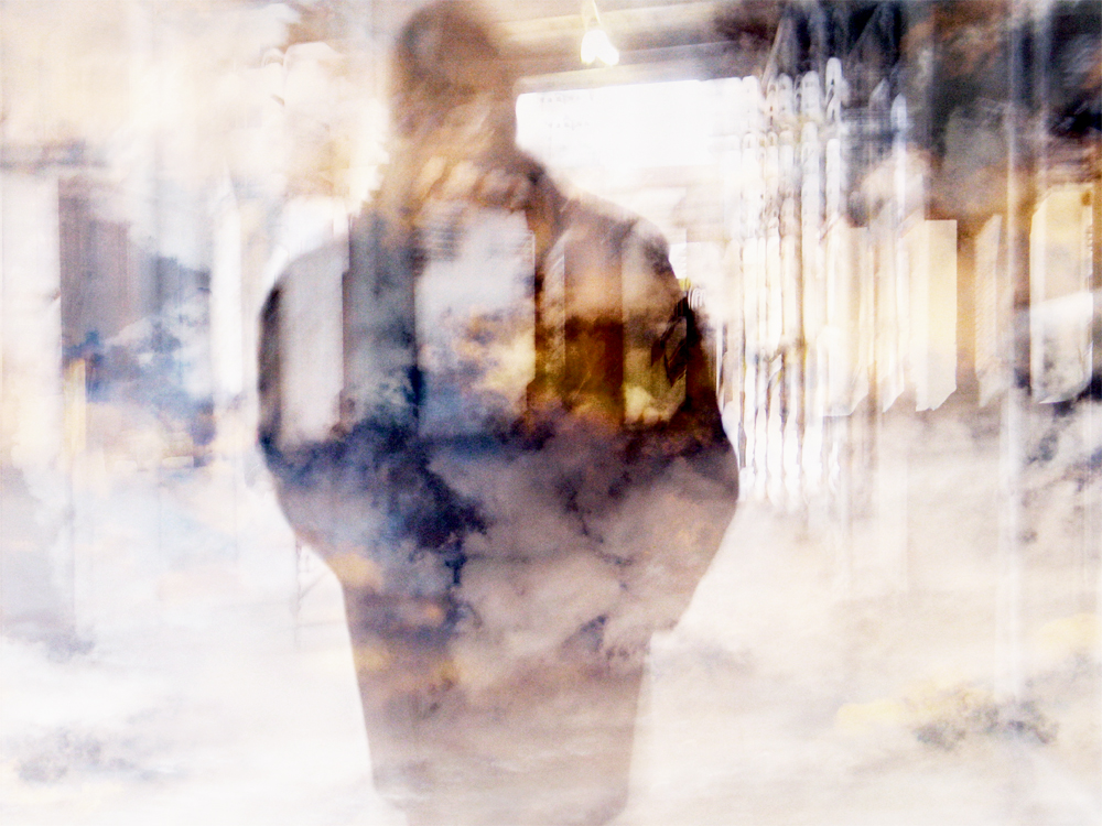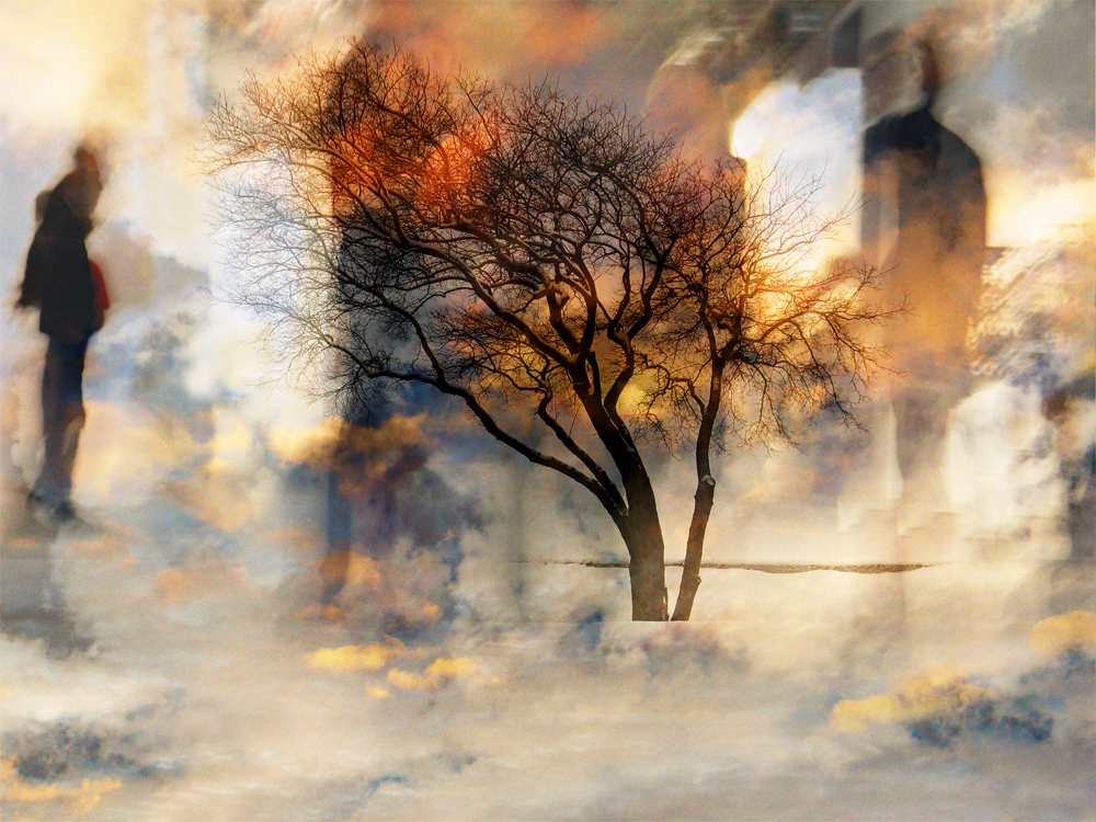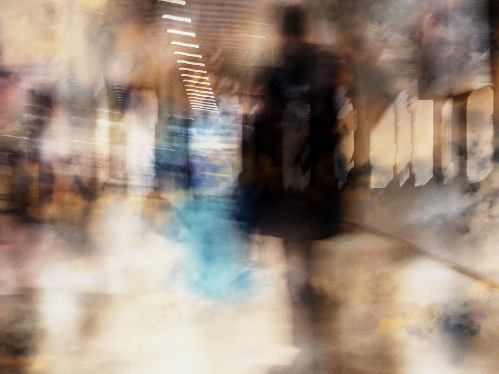 These are digital photo composites. They are not planned or staged, but are found, captured and whole photos are combined in Photoshop. My original intention is to explore colors, shapes, lines and textures. I find the amorphic figures interesting and mysterious, as there is no sense of who they are, where they are or what they are doing. There is always the surprise of discovery, the search for something unique and the irony of making photos that may not eventually resemble photographs.
