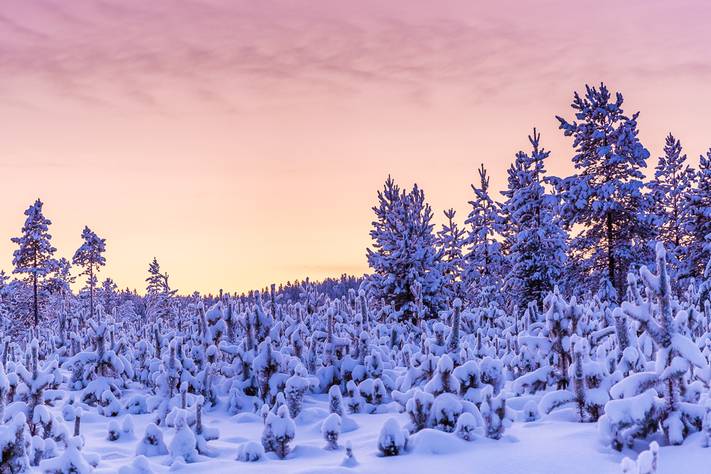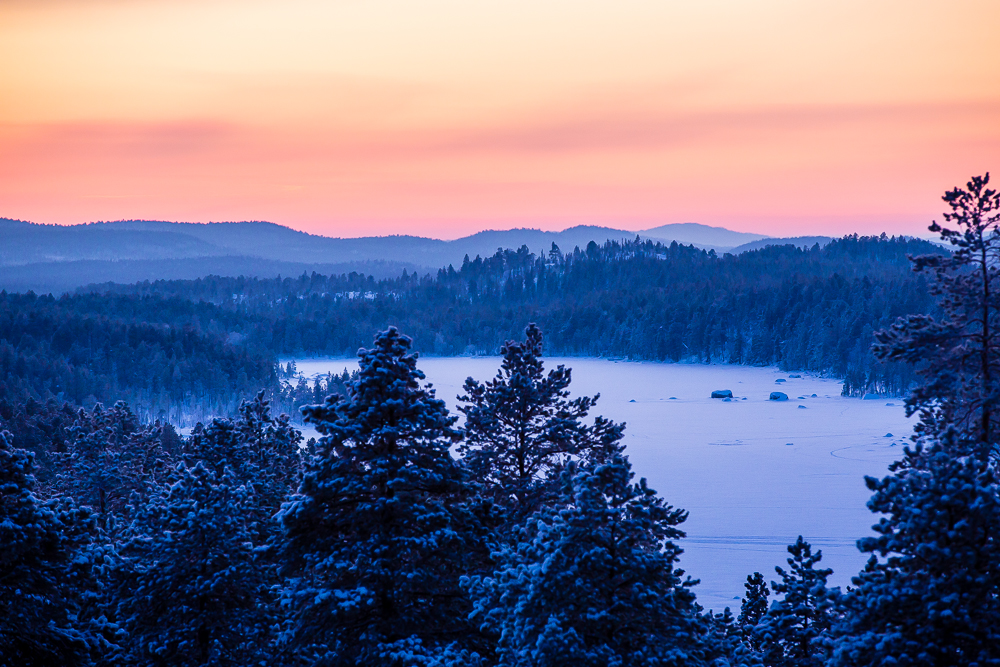 In January, nearly 400km (250mi) above the Arctic circle, the sun never rises. Every clear day looks like a perpetual sunrise or sunset with some of the most amazing colors reflecting in the sky and on the snow.