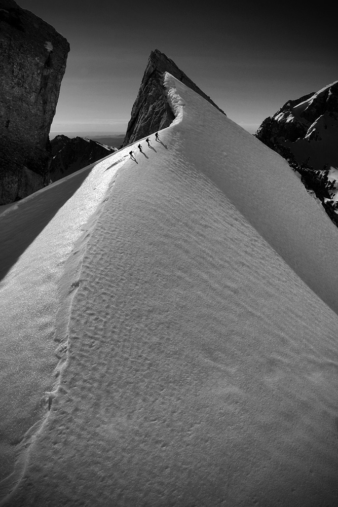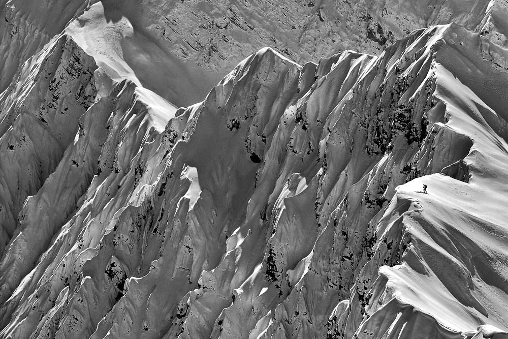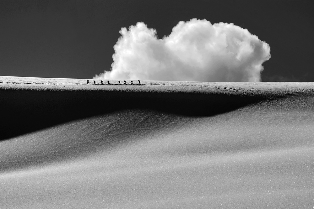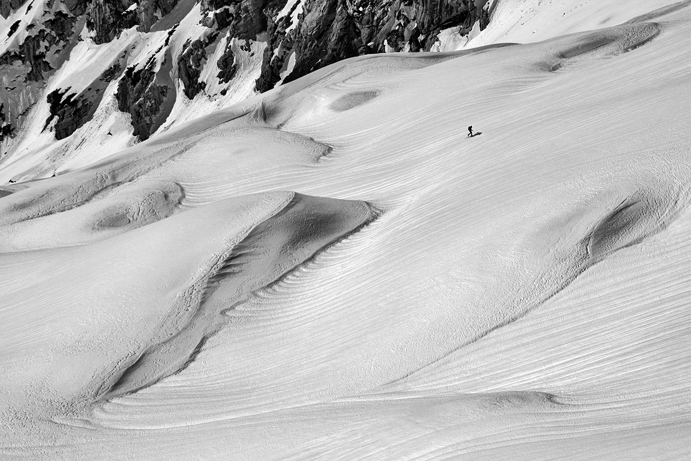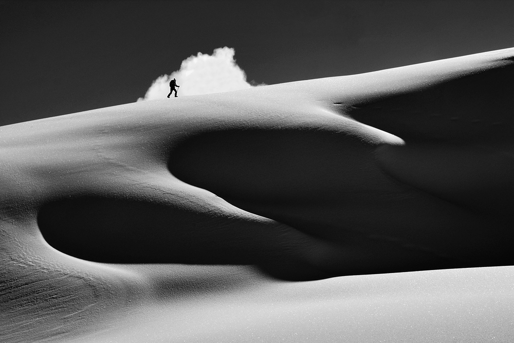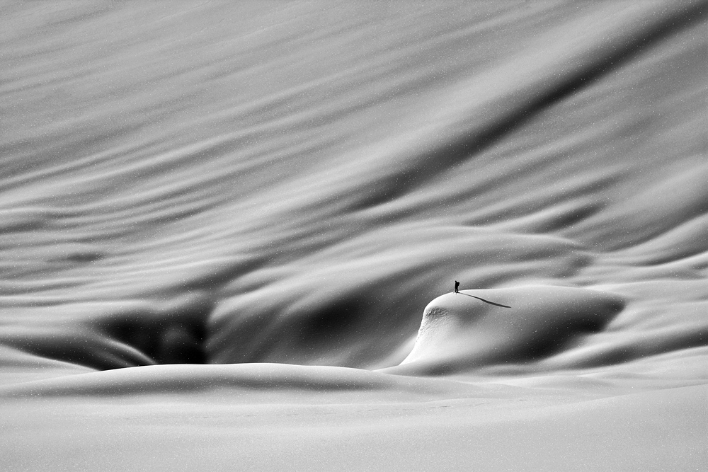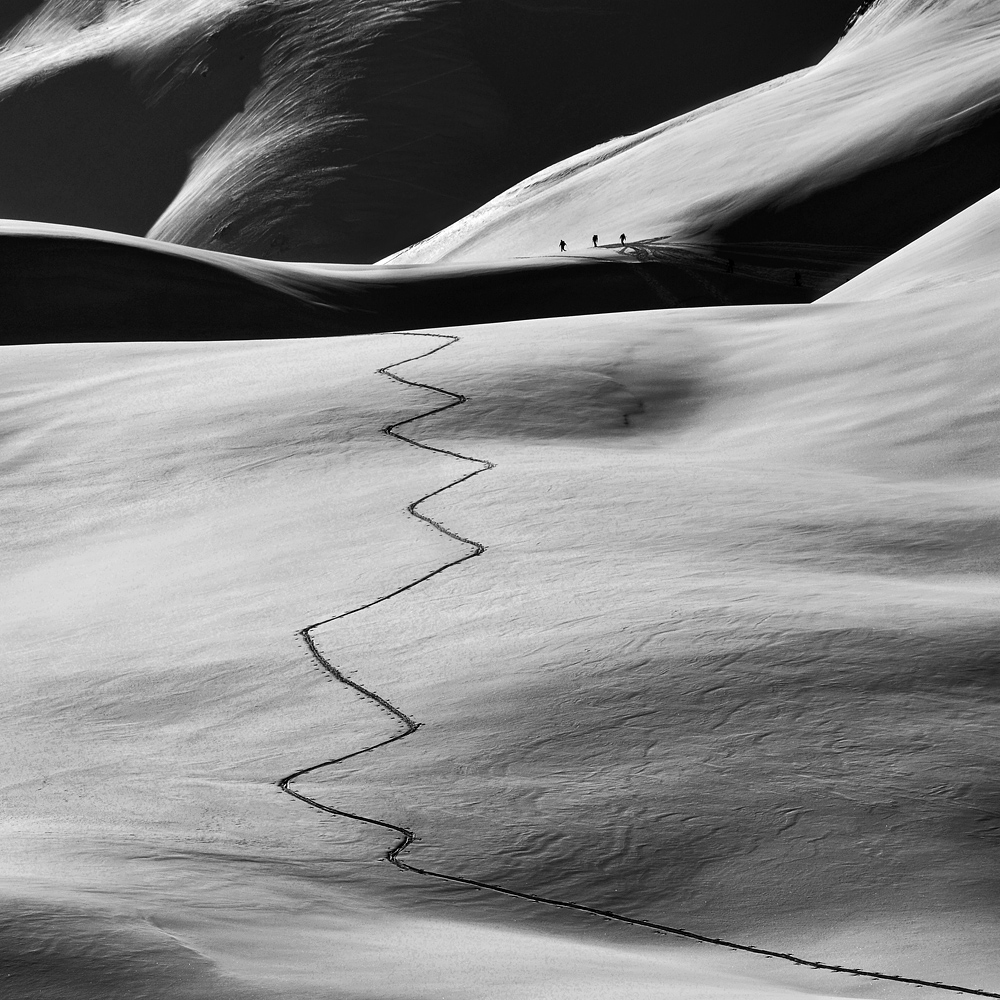 I represent the enchant of the snow-covered mountain landscape, as seen during my ski-mountaineering excursions in the alps. Some of the photos are perfectly true and real, other are composite optical illusions obtained with the insertion of tiny human figures inside close-up particulars of the snow coverage, like a fantastic dream giving the perception of a vaste and unspoiled ambient. The whole series wants to represent the smallness of the human being in front of the hugeness of a pristine mountain ambient.