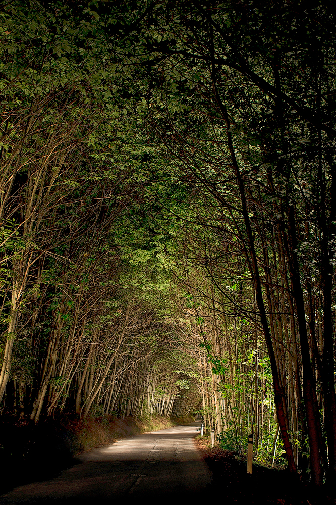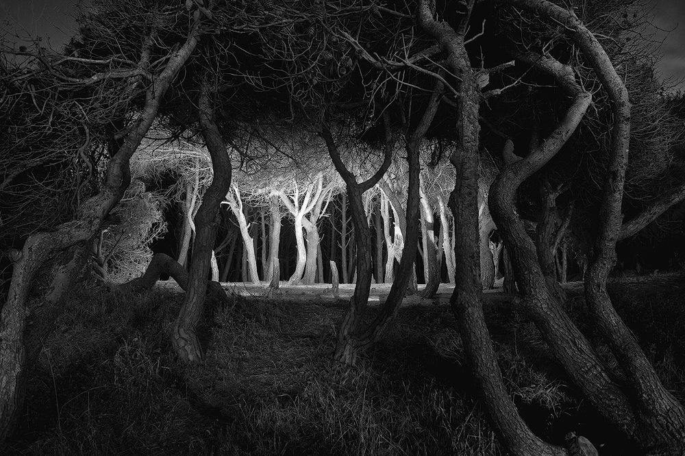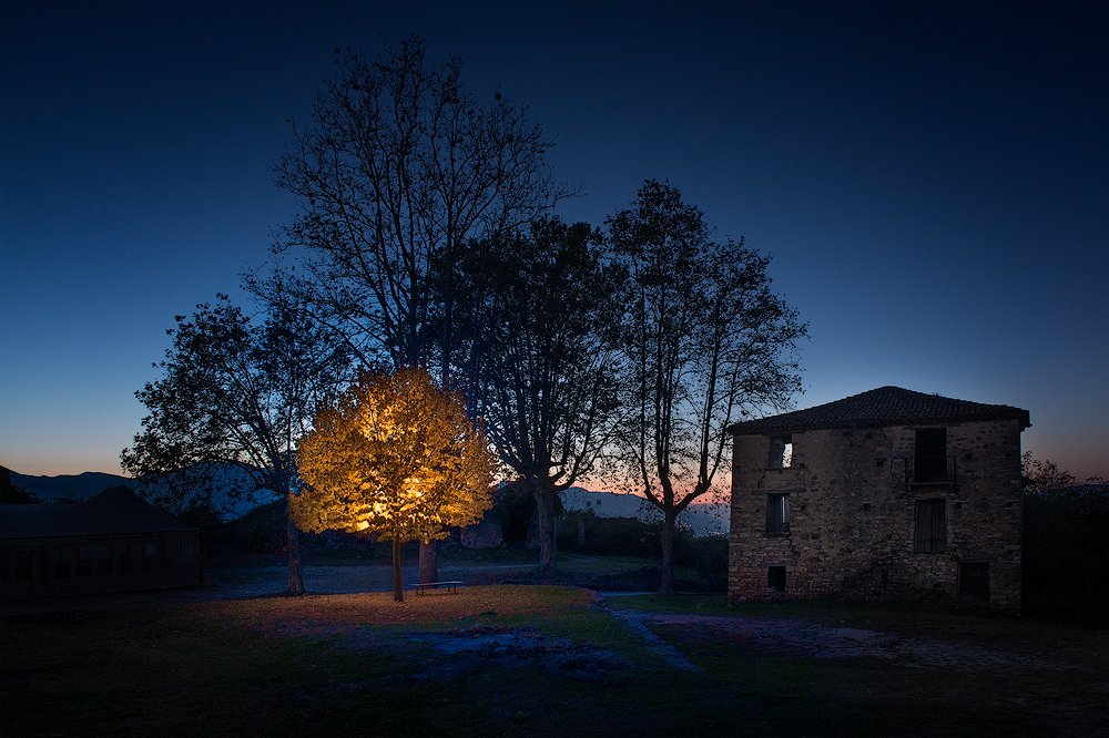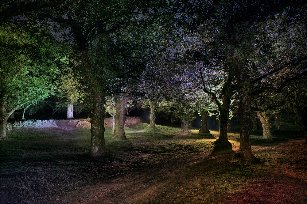 Dark nocturnal wooded places, light painted by hand held torches and gels. Landscapes that exist for a moment, only in segments, for then disappearing again in the darkness; a way to recall the statement ‘Omnia quae sunt, lumina sunt’ (All things that are, are lights) from the writings of the ninth-century philosopher and theologian Johannes Scotus Erigena, one of the guiding principles of the gothic concept about the relationship between the light and God himself.