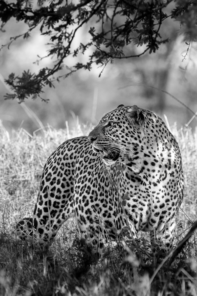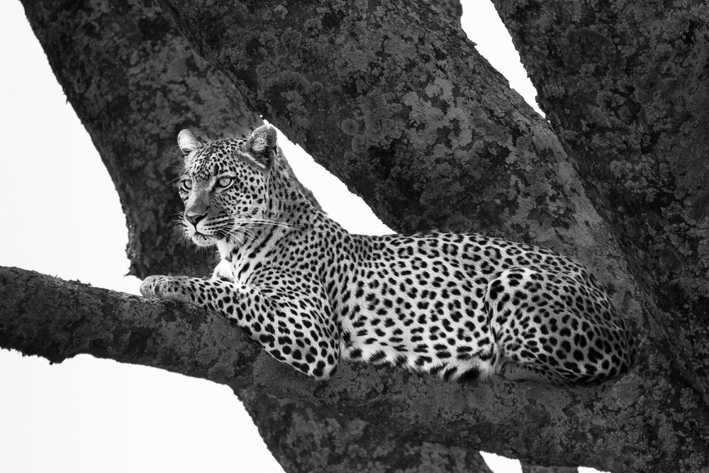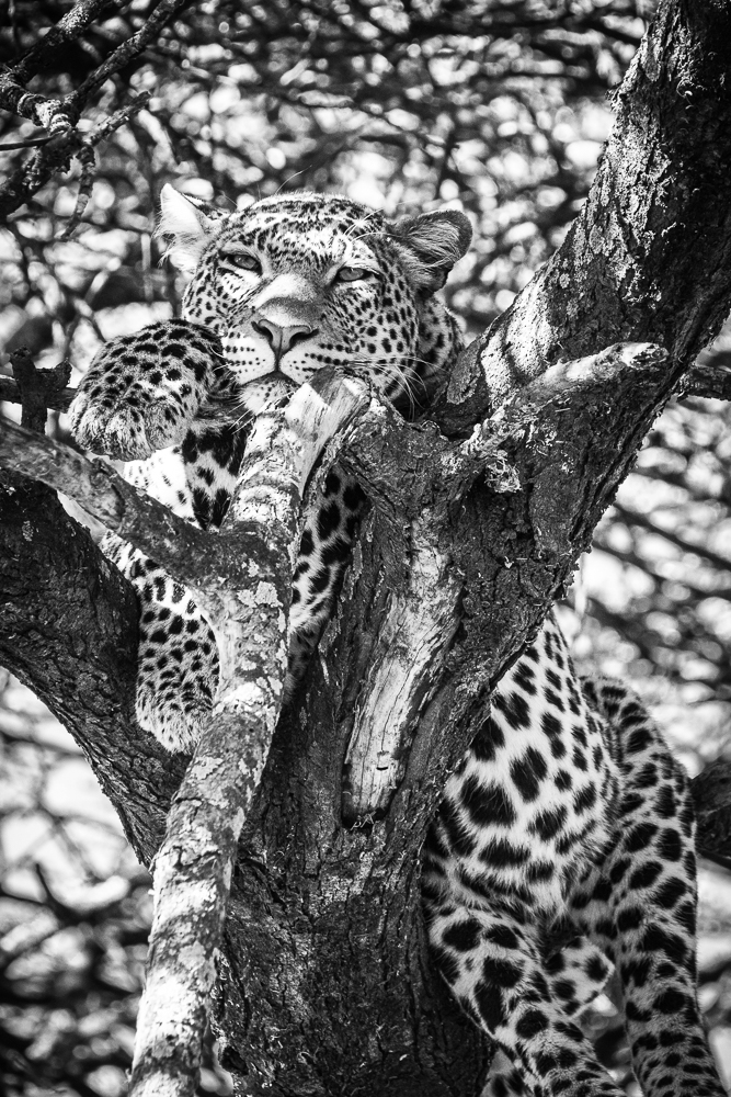 It was only on the third voyage to Africa that I got to see this beautiful and elegant animals. Being very shy animals, leopards spend most of daytime hidden on trees. Their fur gives them a perfect camouflage in the midst of branches, leaves and needles. On a tree they benefit from the view and can search for prey. It also offers them protection from other competing predators like lions. One of the big cats was indeed trapped as lions were laying in the shadow of the leopards tree. It was a good chance to stay for several hours with the secretive animal. Balancing on their tree, leopards show an astonishing elegance and nonchalance at the same time.