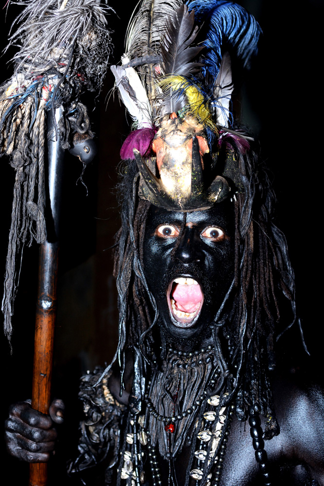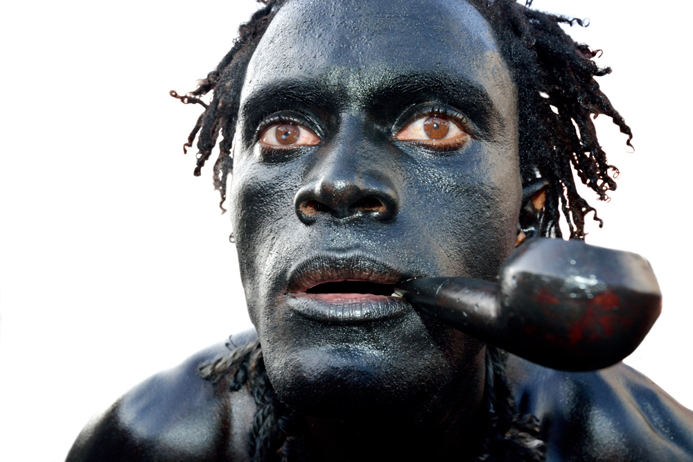 The popular Mandinga Carnival was born in the fortys in a poor and problematic neighborhood of Mindelo, Cap vert. In the folowing 4 sundays before Mardi gras, men and women gather and grease their bodies with kitchen oil and then they rub all over them batterie powder until they are really black. As creole people they revive like that their black origines, creating the figure of king Mandinga, an ethnie from west africa