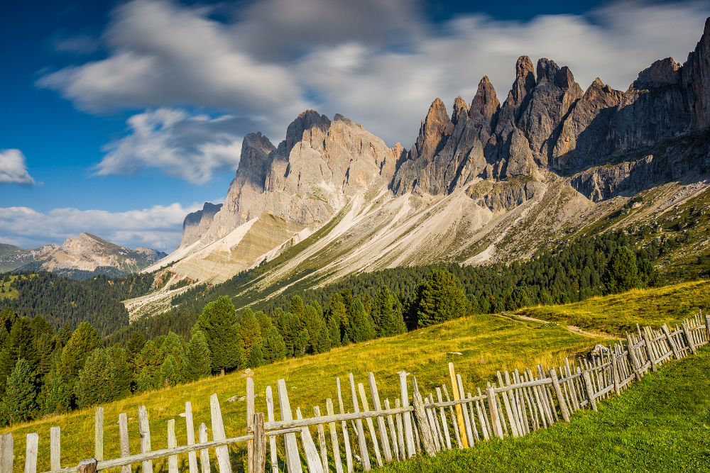 The Odle massif in the Val di Funes Valley, taken from two different perspectives. These peaks are among the most famous of the Dolomites mountains, region Trentino Alto-Adige. Italy.