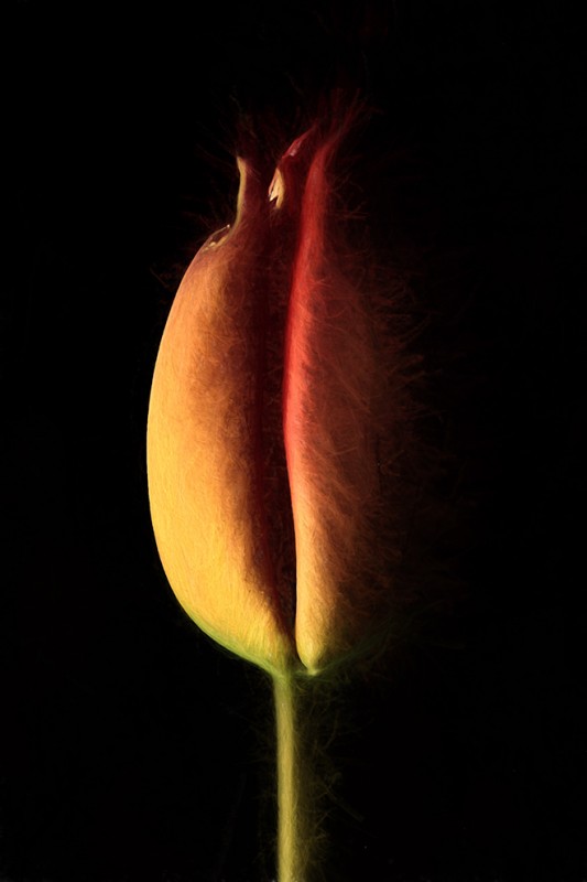 The photo was taken two years ago, at the late afternoon. This tulip just didn't open yet has the shape as a mouth. I edited the picture in order to show one kiss can be smooth happy and delightful and can be painful and confusing depends on the reletionship.