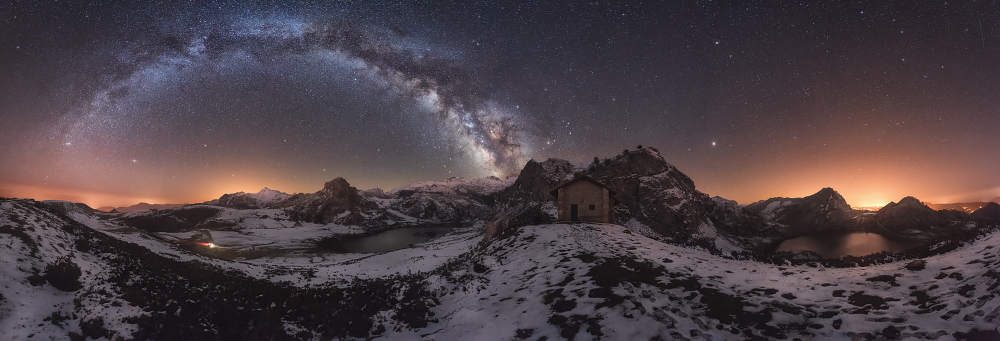 Panoramica of almost 360 degrees of the two lakes of Covadonga (Asturias) under the light of the lactea route and the distant urban nuclei that contribute light pollution. In the center you can see a house of shepherds where they live during the summer to watch their livestock.