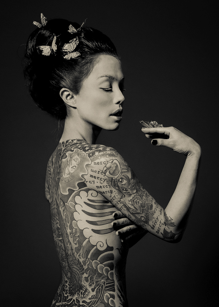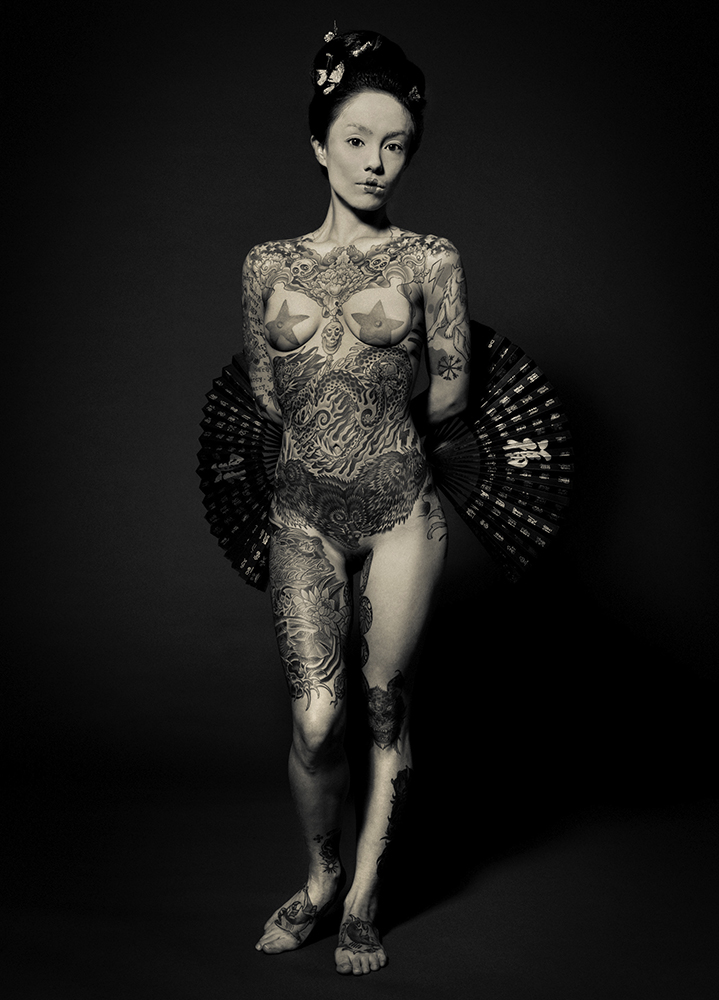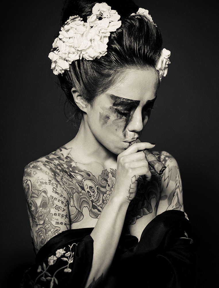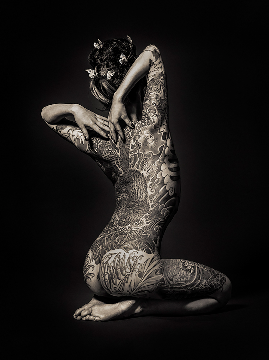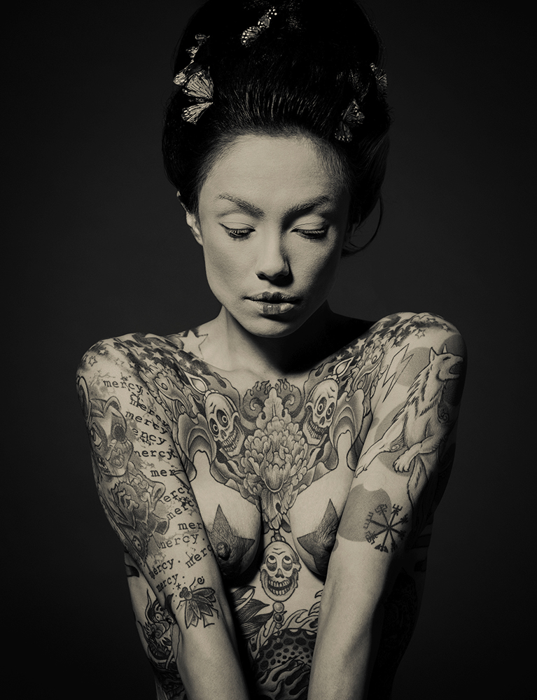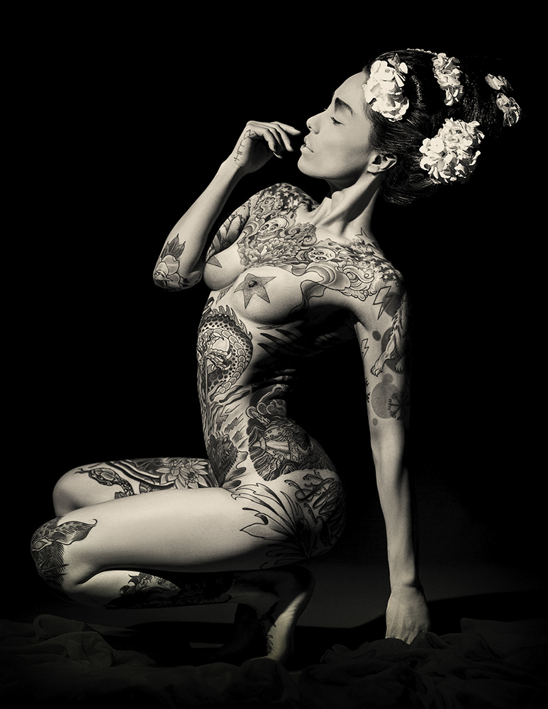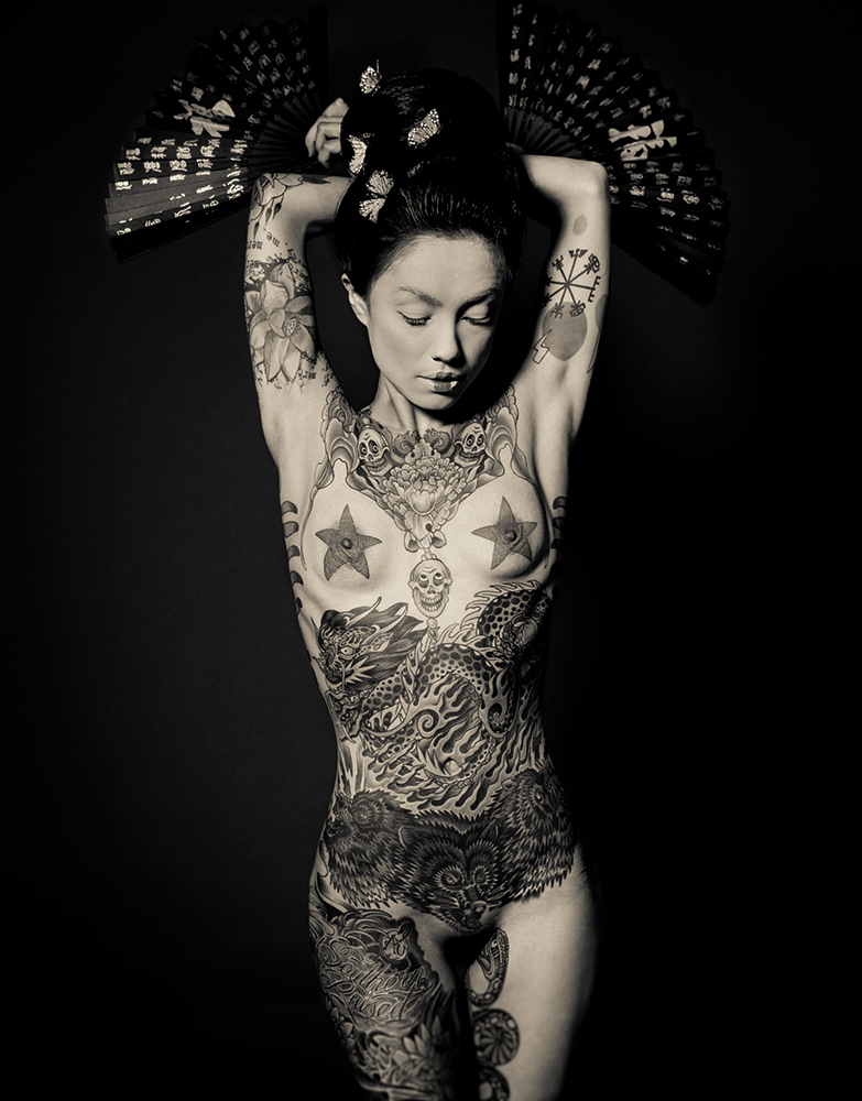 GEISHA INK tells the intoxicating story of Ginzilla, revealing and subverting female archetypes through a visual exploration of sexuality, taboos, eroticism & culture. Our depicted heroine was born into a traditional family of uncompromising strict conservative values. The effect was suffocating to her wild heart, engendering acts of rebellion perhaps most visible as the arresting marks of defiance, written in permanent ink on the canvas of her body. These images tell the story of her life; illustrations of tigers, wolves, and dragons contrast societal expectations of female submission and obedience. Ginzilla’s first lover was a tattoo artist, a predilection which has guided her sexual journey. All of her body-art was composed and executed by lovers, compounding its personal meaning to her, while providing a veritable map of her life. She is presented for the viewer’s meditative contemplation as a symbol of strength, defiance, and unapologetic female desire; her body on display for worship, the tattoos adorning it, as if prayer beads of a rosary.