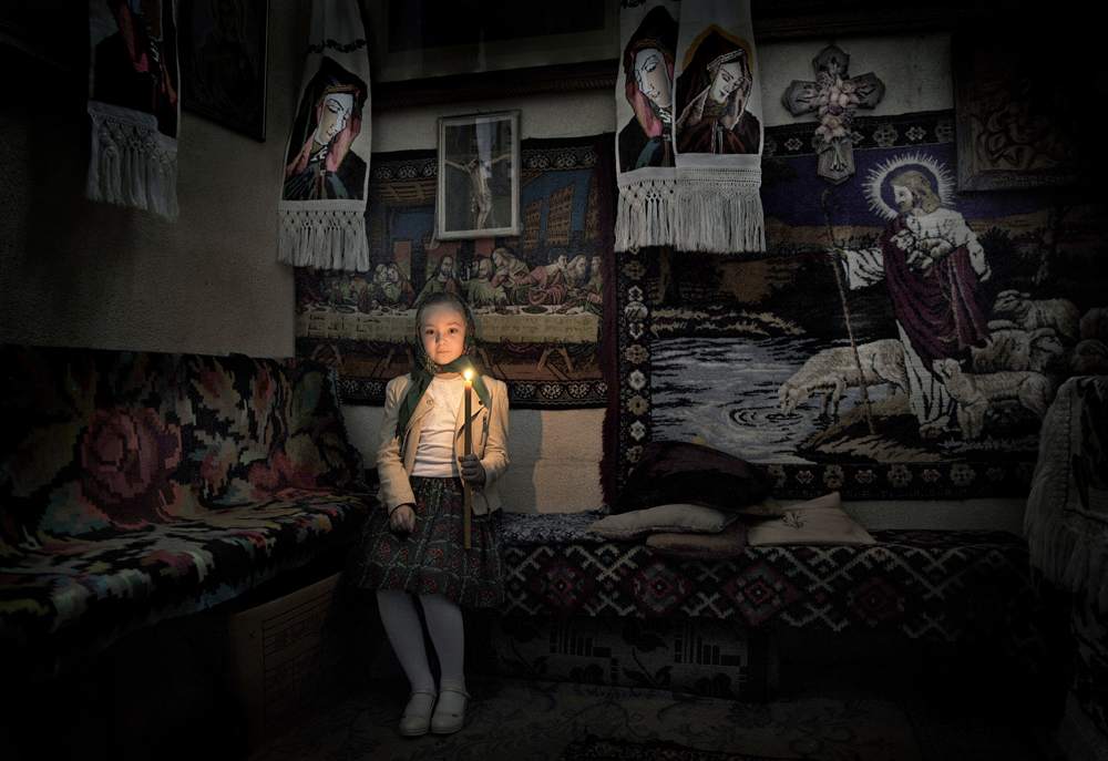 A girl in prayer room at the occasion of the special Easter Sunday liturgy in one little village from Maramures area of Romania