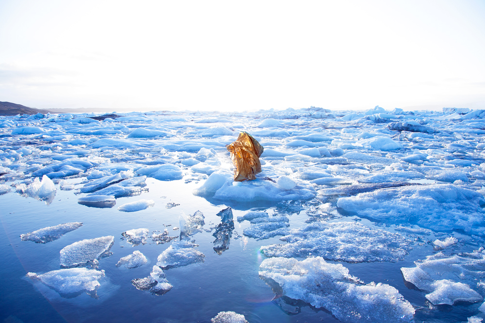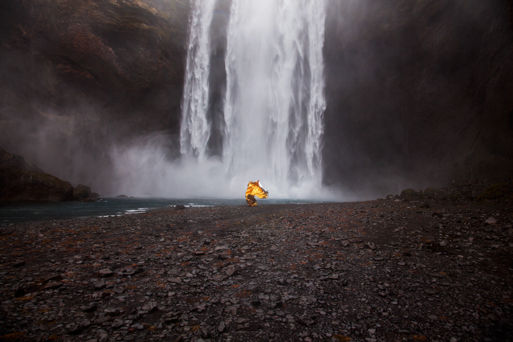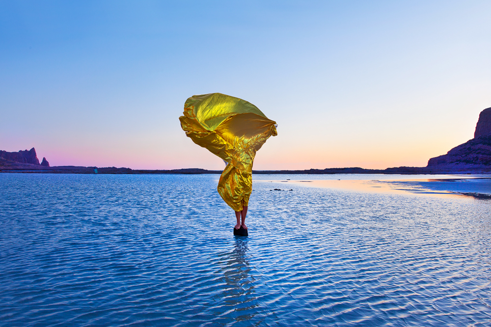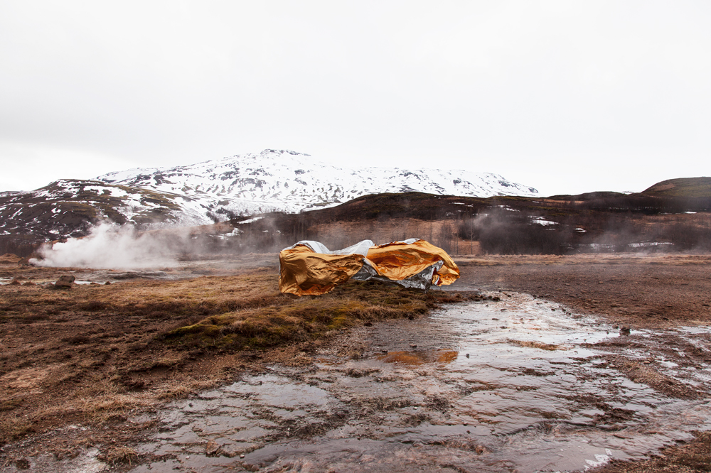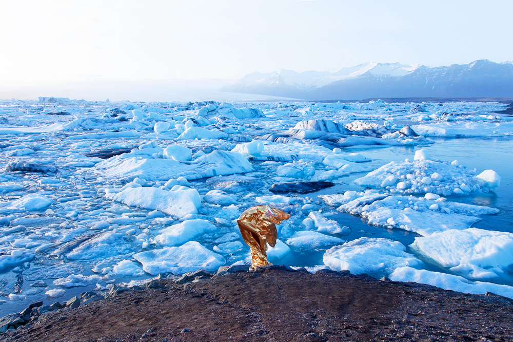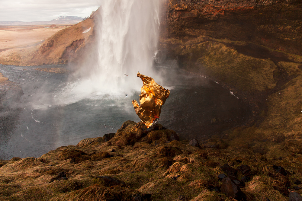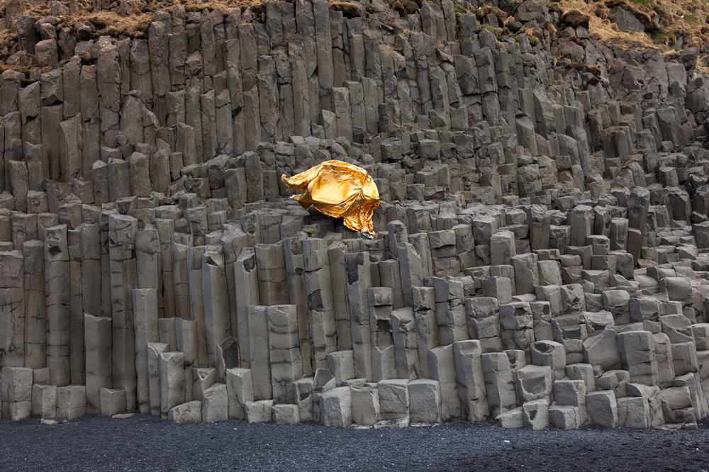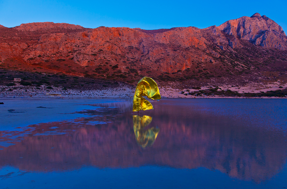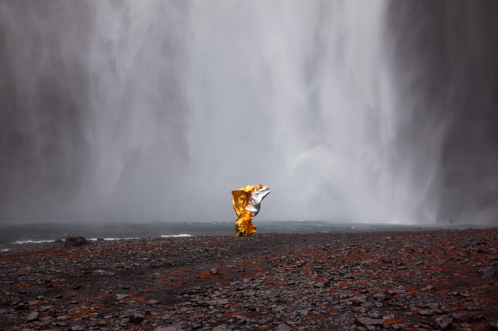 Wind Sculptures is a photographic experience that present unpredictable sculpture created by the wind that only the instant of a high-speed camera can sculpt and keep it forever. A photograph as a sculpture and recorder of a performance. The entire project was taken around Europe, Italy, Greece, France, Switzerland, Portugal, UK and Iceland. The artist is also a subject of this theatrical sculpture where human and nature collaborate in a performance with even changing results. “The material used for my project is the same used by the coast guard to protect the migrants from the cold or from the sun as soon as they reach the coast from the sea. The thermal blanket is an iconic material, a symbol of salvation and generosity of the human being.†The material used for this wind sculptures is a thermal blanket, a special low-weight and very thin aluminium sheet, gold or silver, developed by NASA in 1964 for the US space program. It is used for emergency kits as a thermal insulation or as a locator beacon.