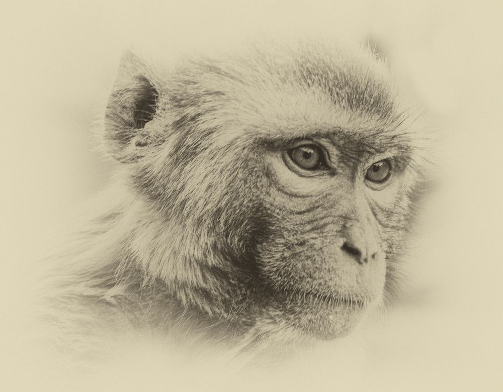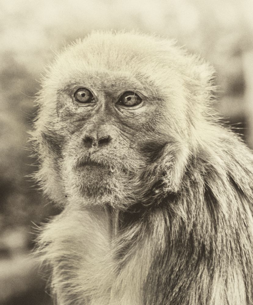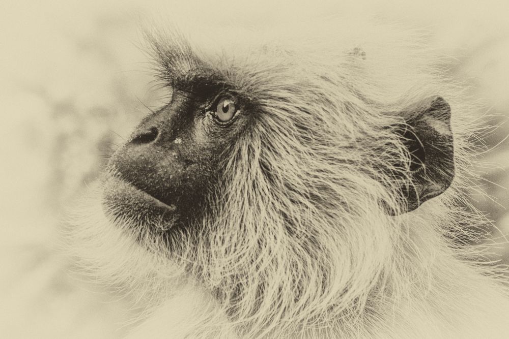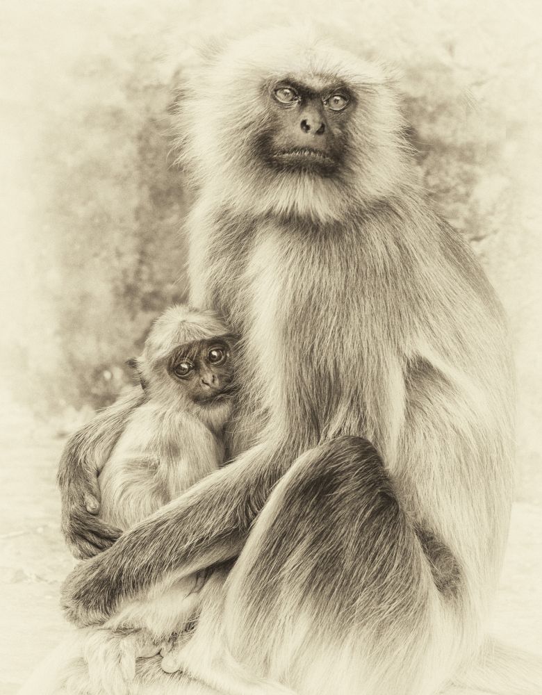 I photographed these monkeys in the Galtaji Temple (temple of monkeys) in Jaipur (India). I was very impressed with the expression of their eyes that is often identical to that of humans. I chose to represent them with a sepia color nuanced to emphasize the fact of how ancient is our descent from these old progenitors.