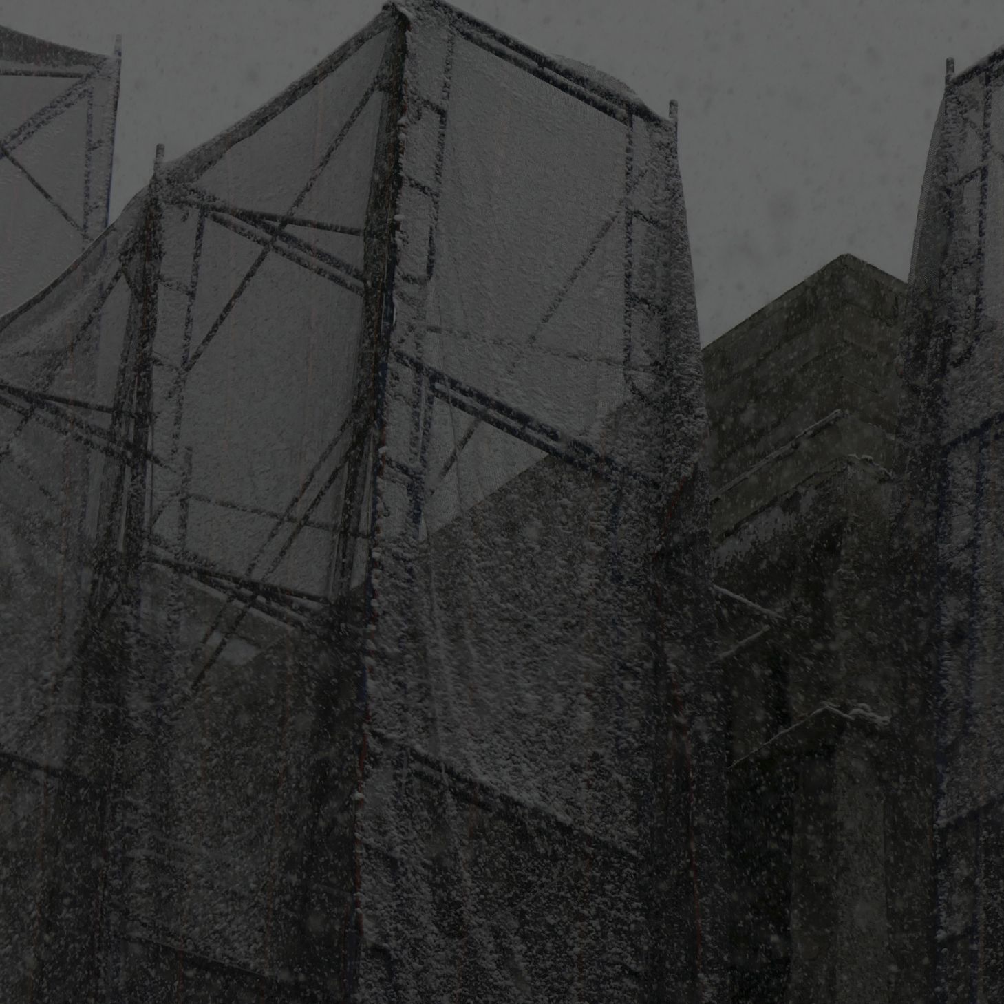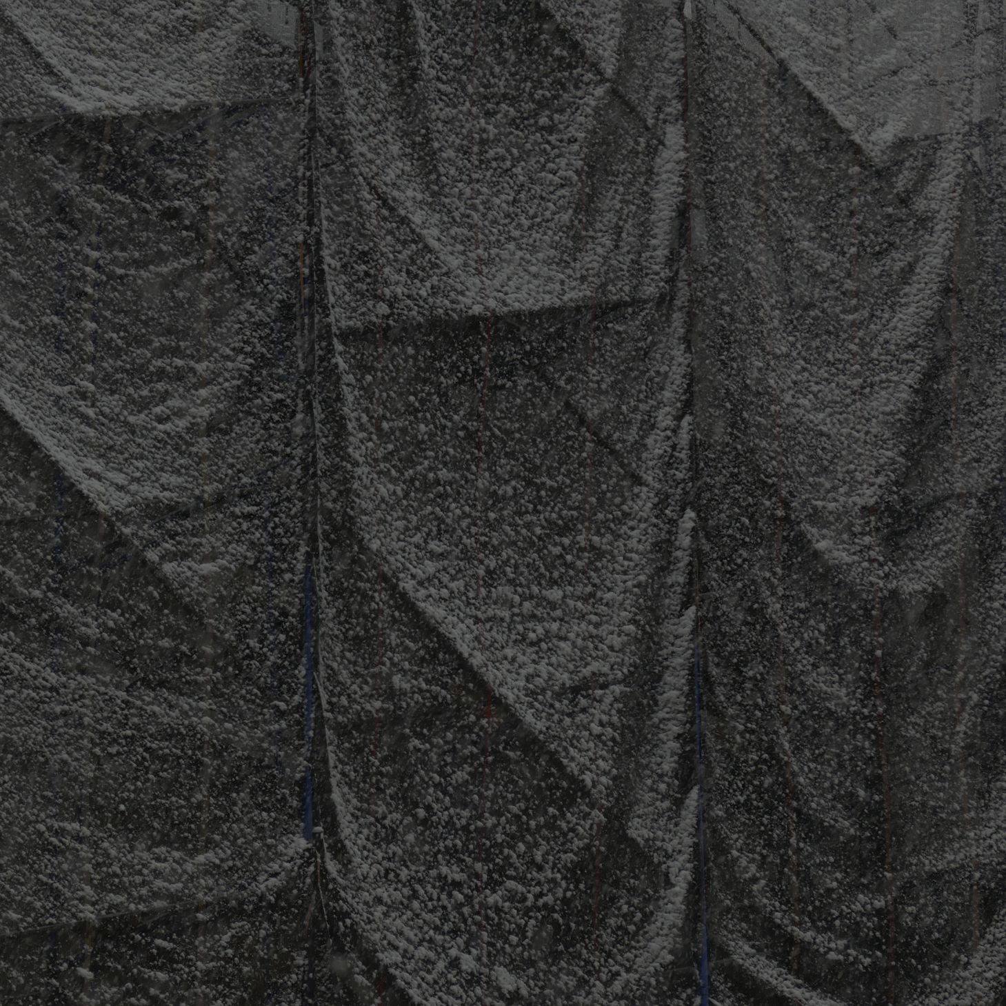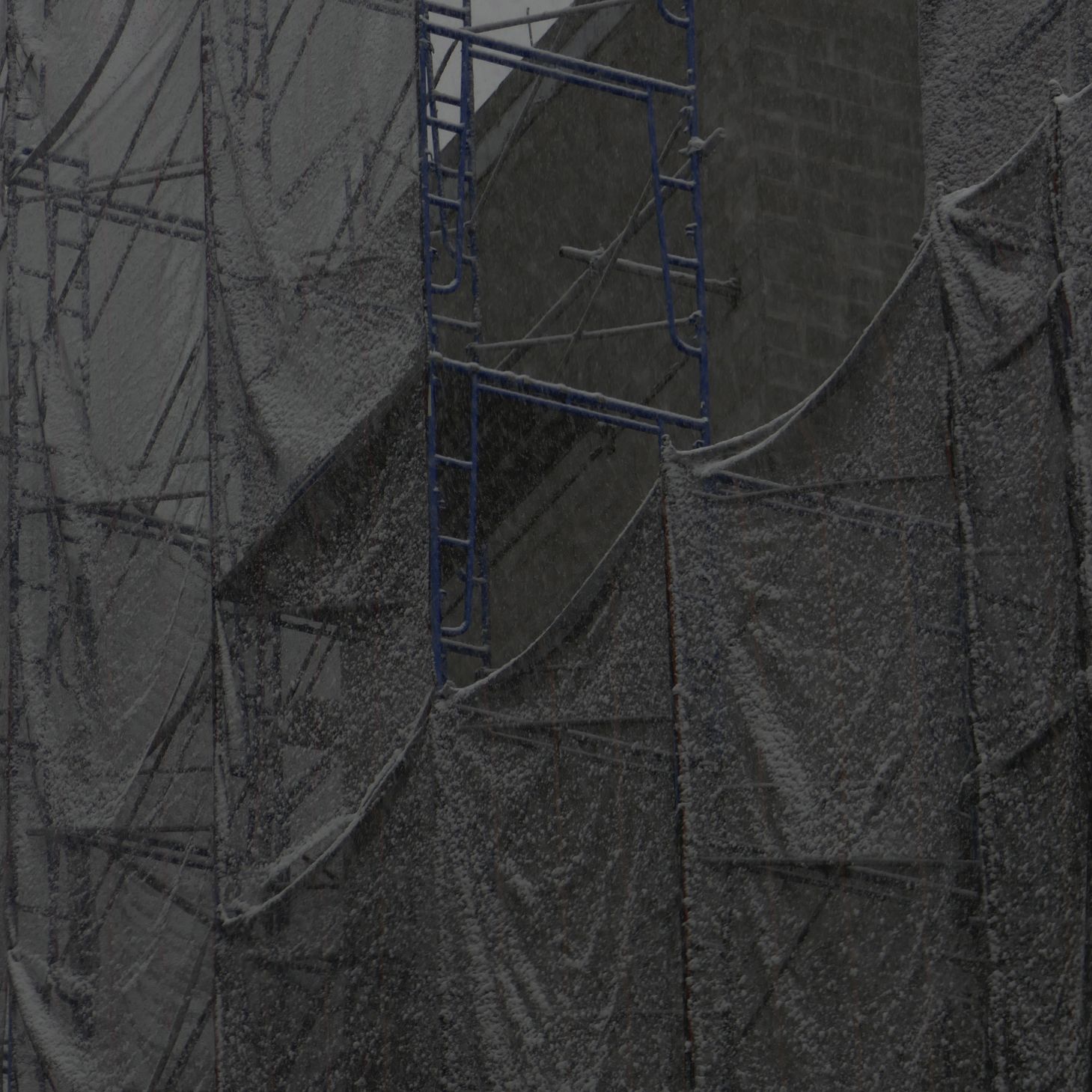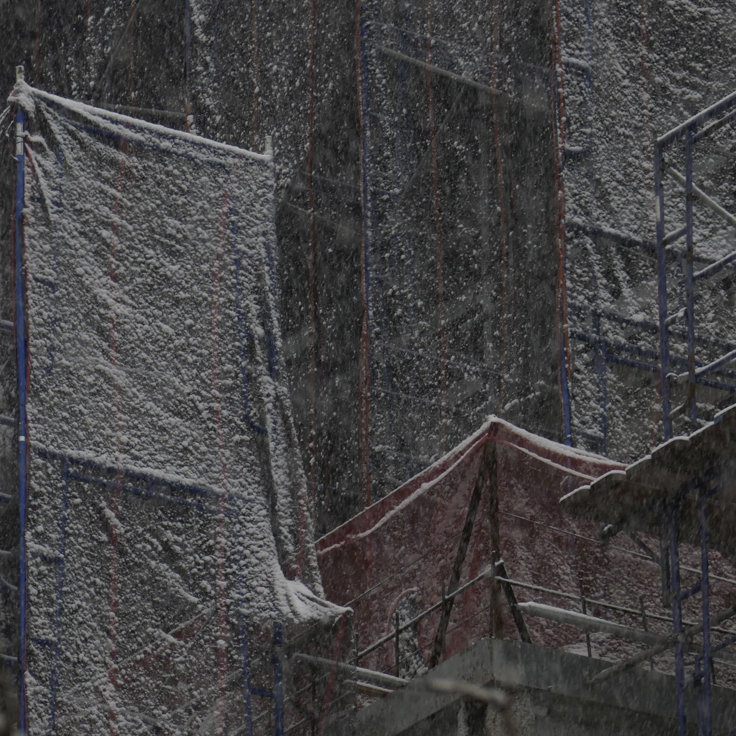 December 2017, snowflakes sticking to the fabric covering the scaffolding.