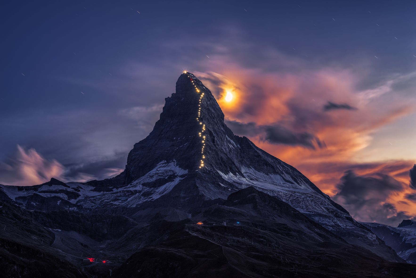 In 2015 Matterhorn was illuminated for the jubilee marking 150th anniversary of the first ascent of the mountain. 50 lamps along the Hörnligrat gradually lit up until all illuminated the path of the first ascenders from 1865. A red lamp marked the place below the summit where four alpinists fell to their deaths.