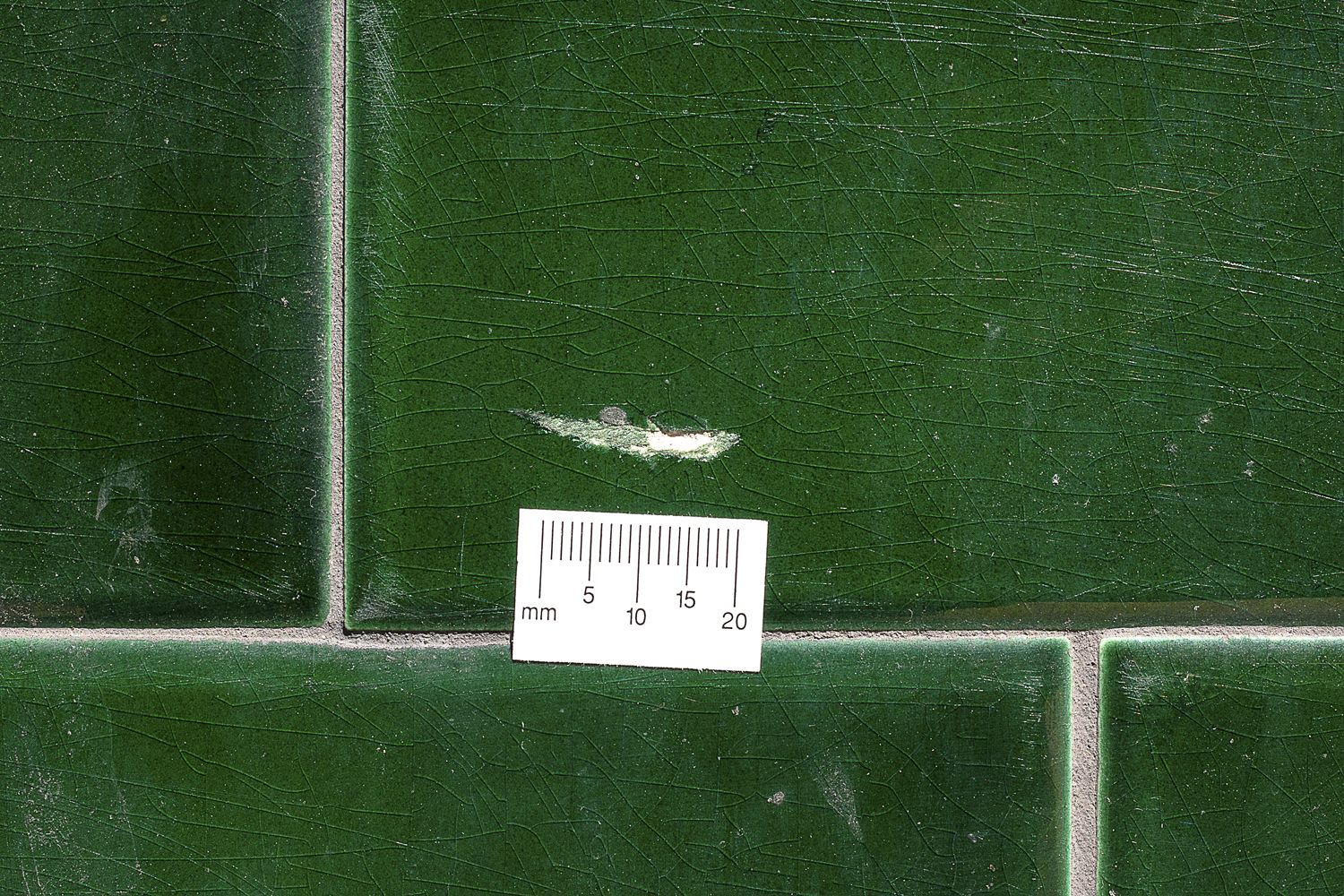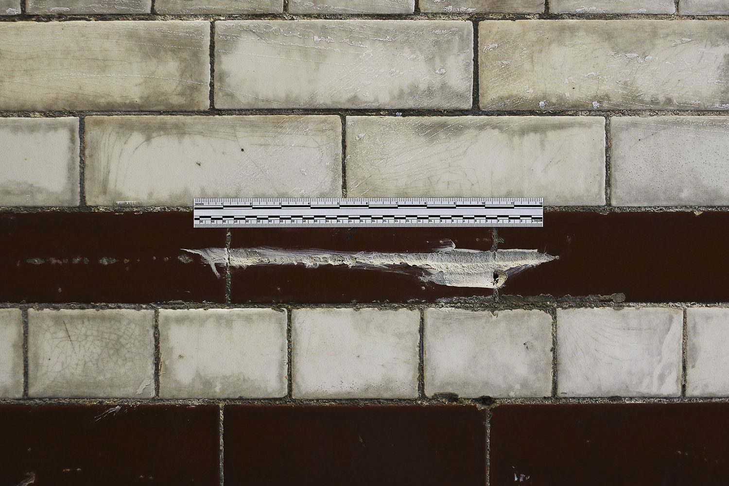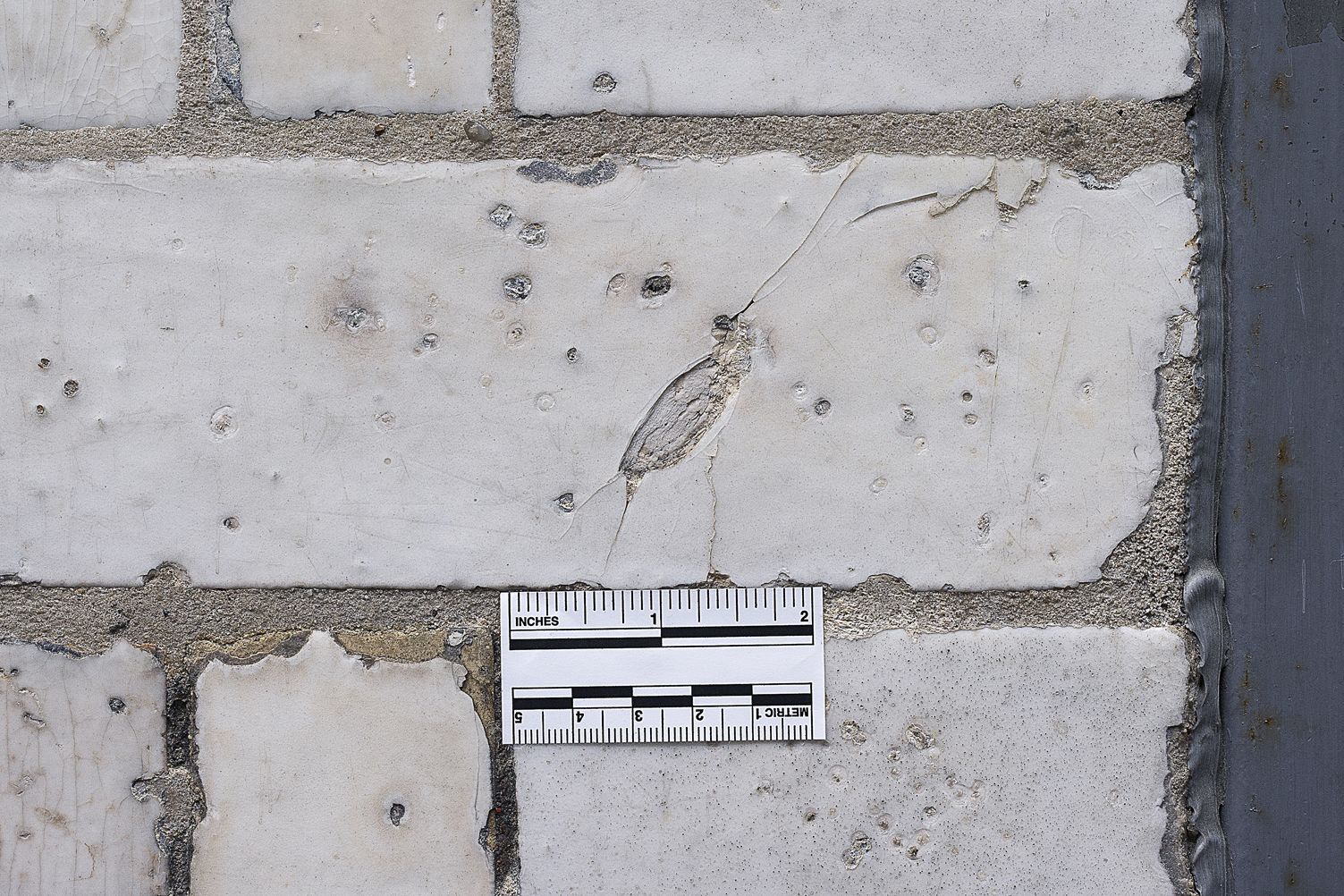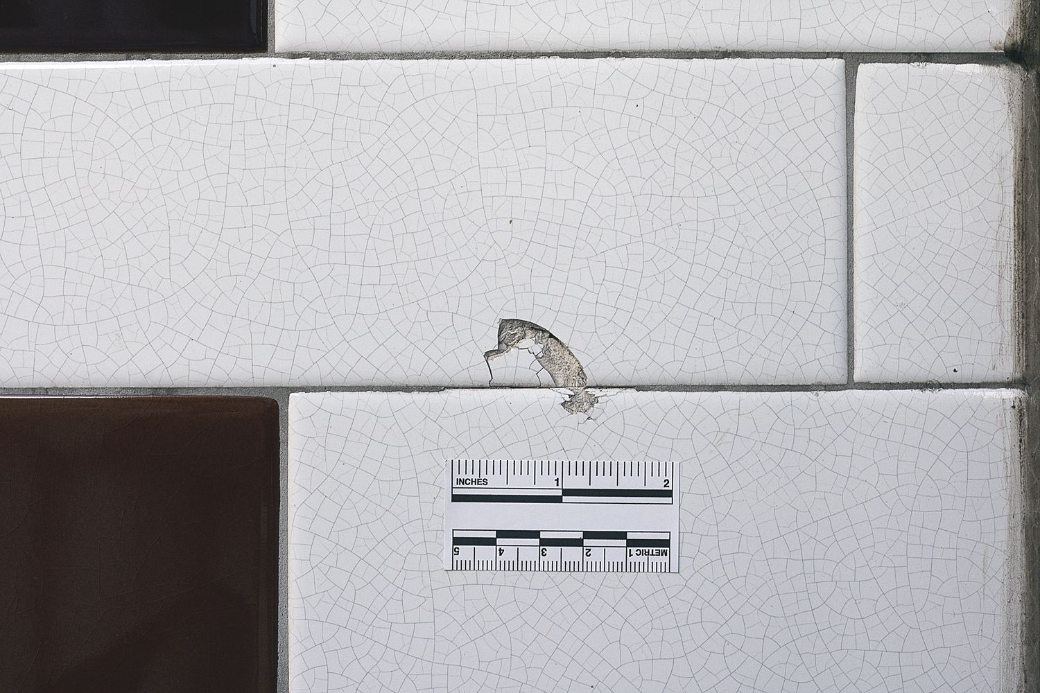 The concept behind this series of photographs is to explore Wolfgang Iser’s determinations of the fictive and my current photographic investigations into crime scene photography. My method takes an appropriate pre-existing subject and via the inclusion of suitable forensic markers reconfigures the found subject. This reconfiguration intimates the demarcated surface as evidence to an unobserved crime. In photographing the fictionalised “scene” I choose to categorise the subject as evidential. What stays unclear is whether the identification of the subject as evidence is truthful or false.