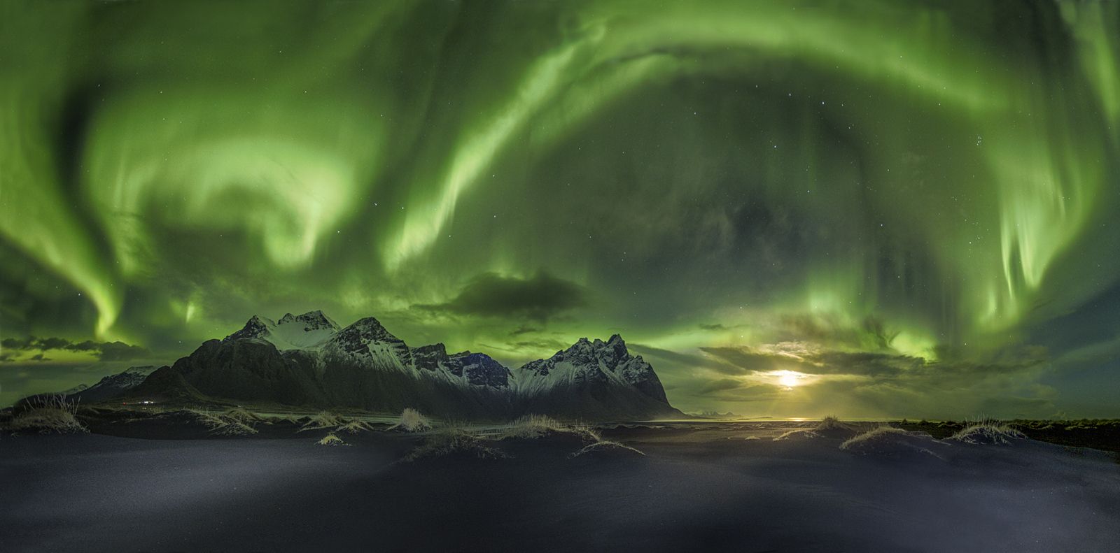Panoramic image taken in the Southern-east Iceland in November 2017, Moon rise during the spectacular show of the Northern lights created the interesting atmosphere below the Vestrahorn mountain ridge. I was pretty happy with the conditions during takingl this panorama picture, especially because I have pre- visualised the result for more times, before, but just was not as lucky as I was for this time.