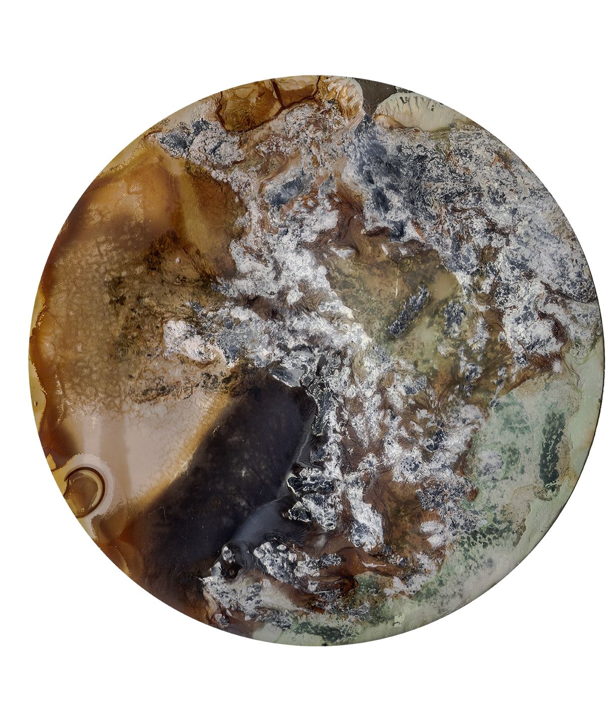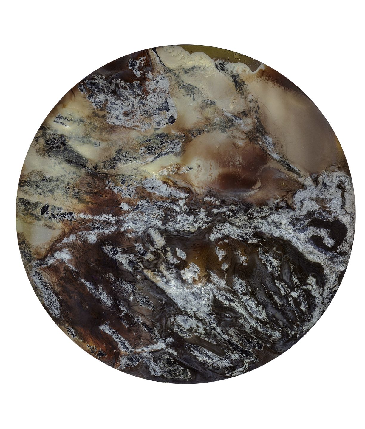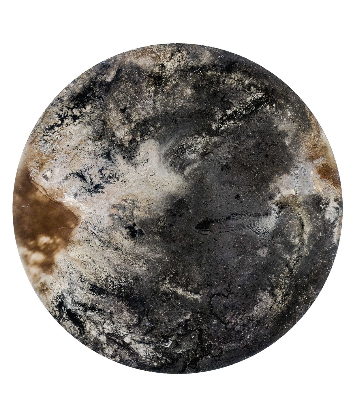 By chemically destroying pictures of familiar people and comforting places, the project depicts living with agoraphobia and the desire to break that safe environment created by being held in a safe space. The pictures were injected with various chemical substances as alcohol and hydrogen peroxide as a symbolism of healing a condition that could get worse by living in the same environment, watching the same images one time after another. As a result, new "landscapes" or "realities" are created looking alike to hostile, chaotic, unexplored planets. Manipulated round frame edition Instant film