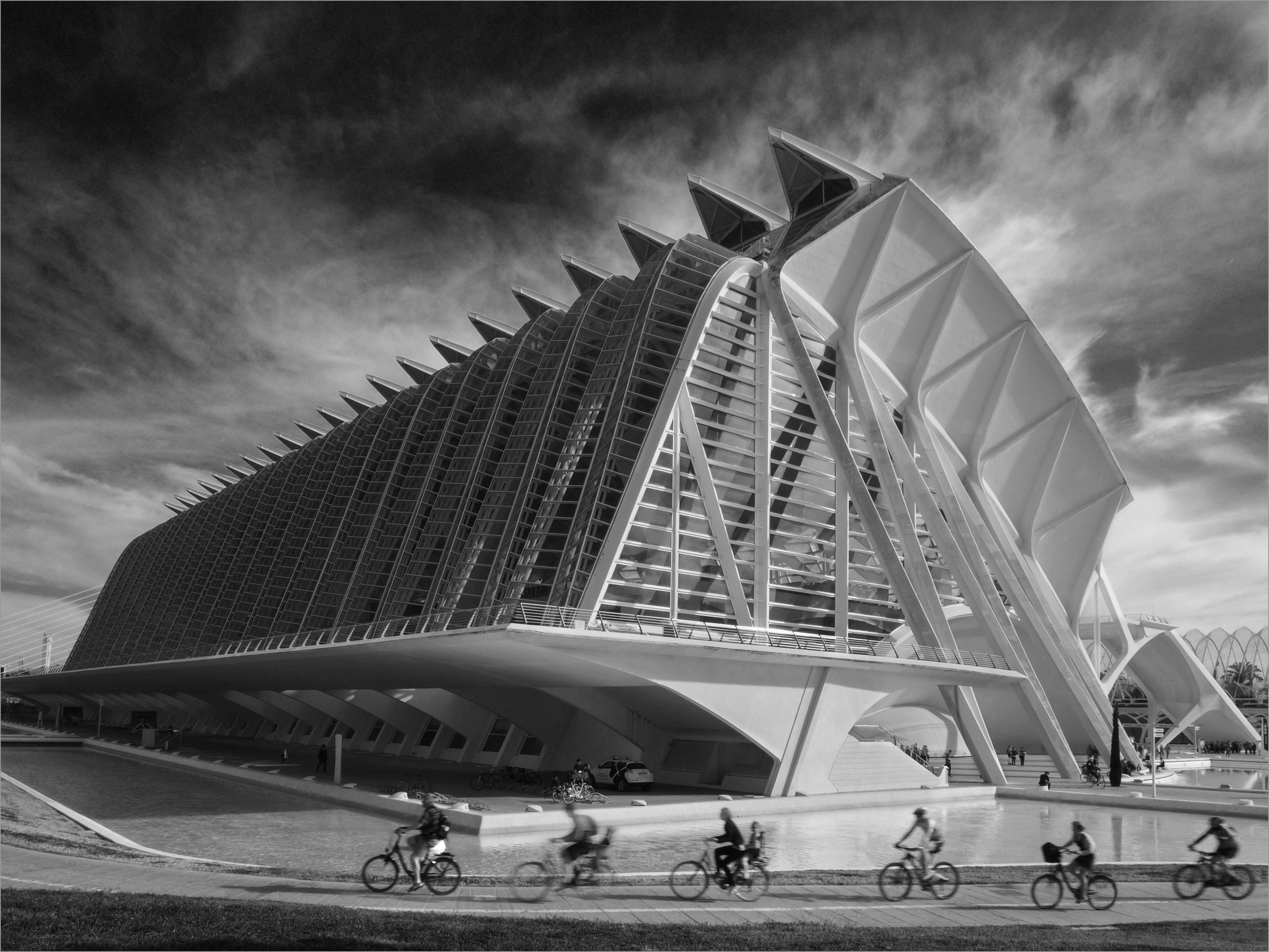Evening light on the Ciències Príncipe Felipe museum in Valencia with the movement of cyclists juxtaposed against the clean lines of Calatrava's architecture.
