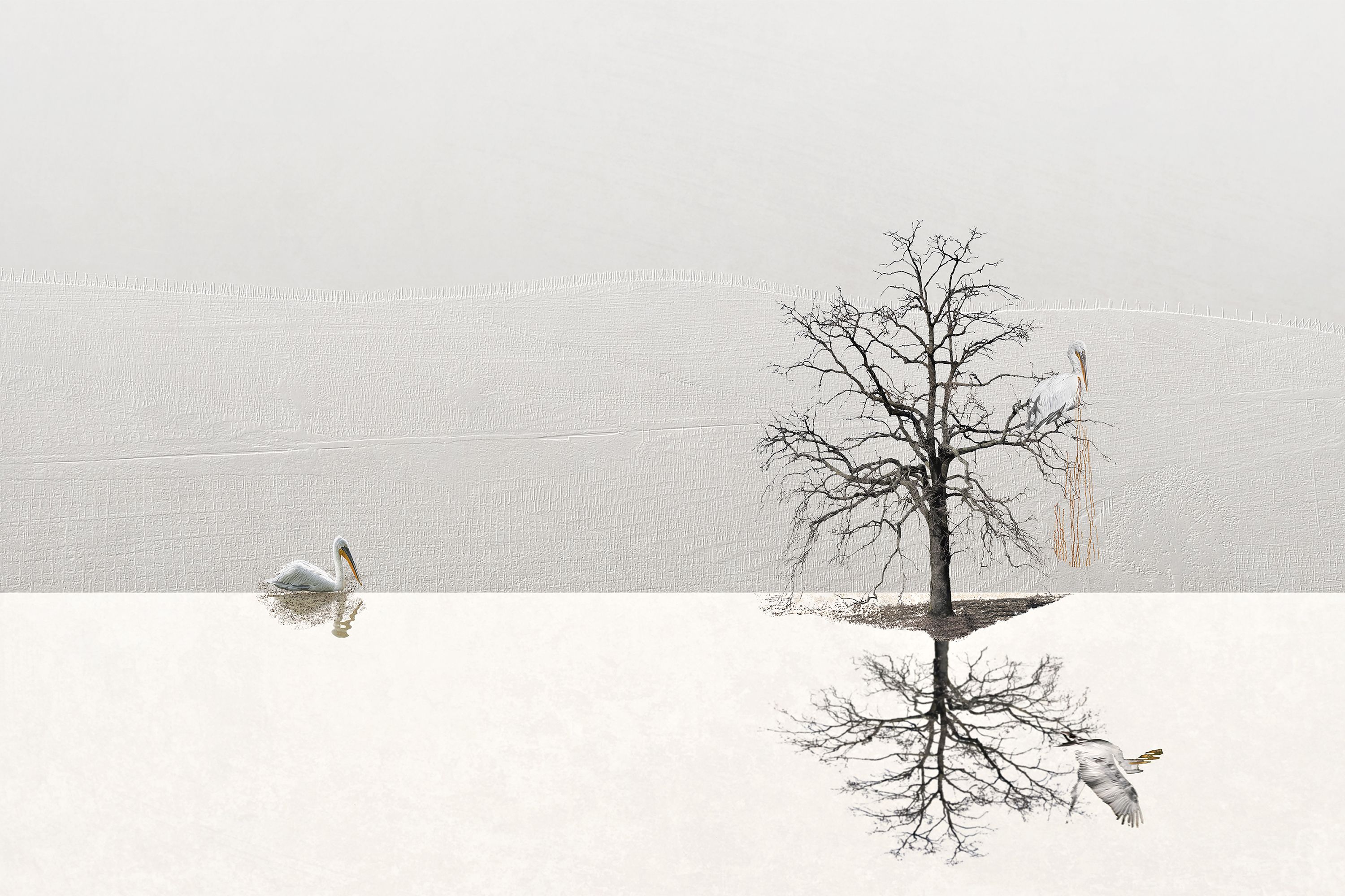 Pelekus, from the ancient Greek ax, recalls a macabre beak. Pressed against the chest, smashes the fish into the membrane bag. The image that weighs the cost to feed the little ones inspired the symbol of Christ pouring blood for the redemption of men. The pelican is also elevated to emblem of charity. In the work, the reflection is a time mirror and a lens to give another look. The pelican moves from left to right, from water to tree, from above to below. What you see reflected is not always equal to the start’s point. It depends on who looks at it and what it is looking for.