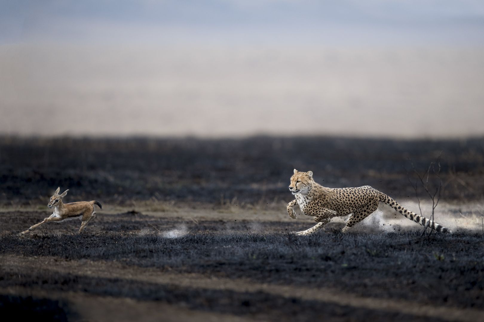 In one of my recent Masai Mara trip I was just concentrating only on cheetah hunts. So me and my guide we spoted a cheetah and spend the whole day watching it closly. This happened for many days and on the second last day of my trip this cheetah targeted a small gazelle. This is the same moment when I observed some area where the grass was burned. So I asked my guide to park the vehicle in such a way that if the cheetah comes that way I can capture a good frame. Luckily the cheetah started running towards the gazelle exactly the way i wanted and I was able to capture this picture.