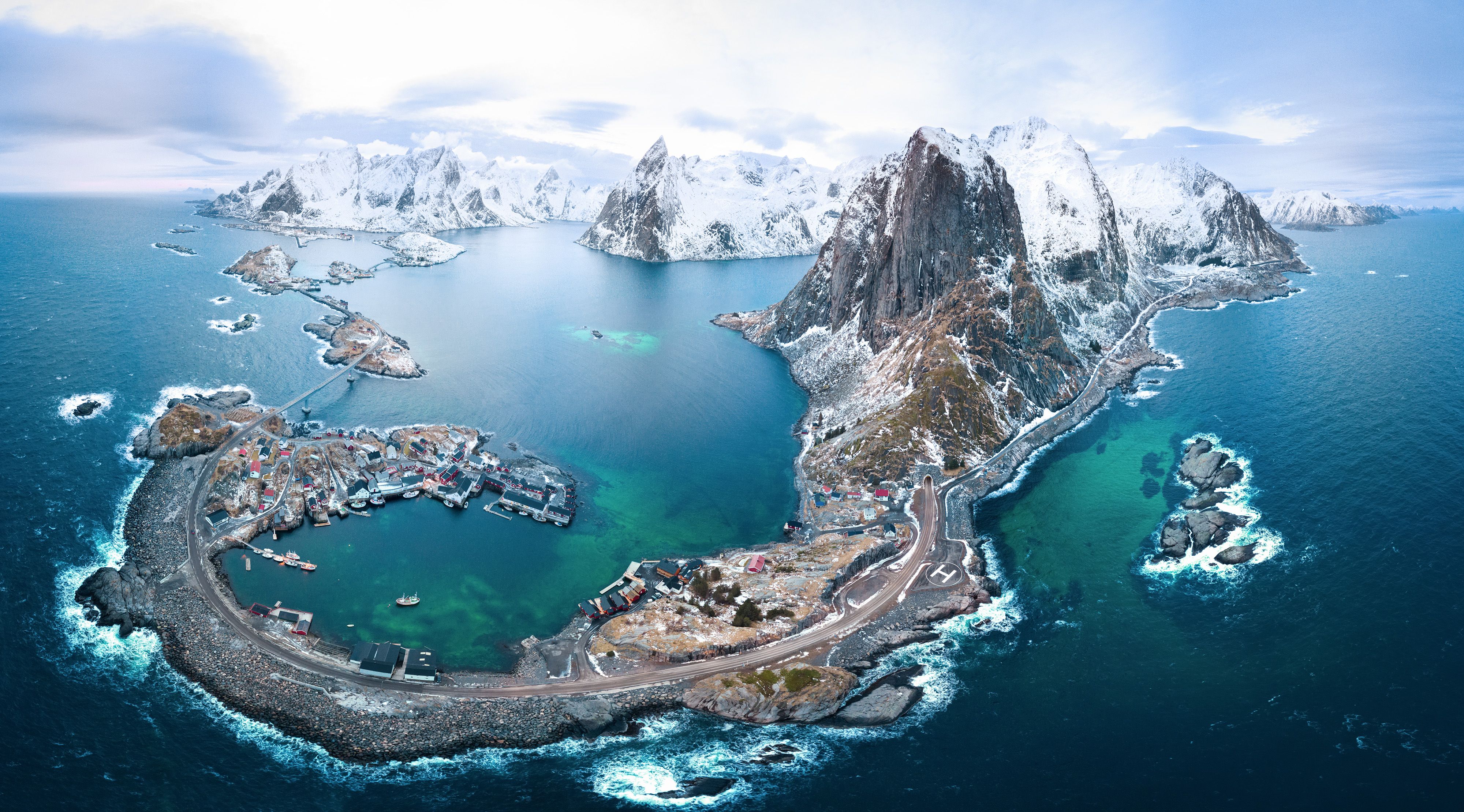 The breathtakingly beautiful Lofoten islands from above! You can see the villages Hamnøy and Reine, snow covered mountains surrounded by the raw Atlantic Ocean during the sunset light. The 28 image panorama was taken by a drone.