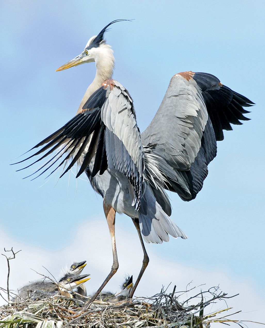 A Great Blue Heron spreading it's wings as three newborn chicks look on in amazement.