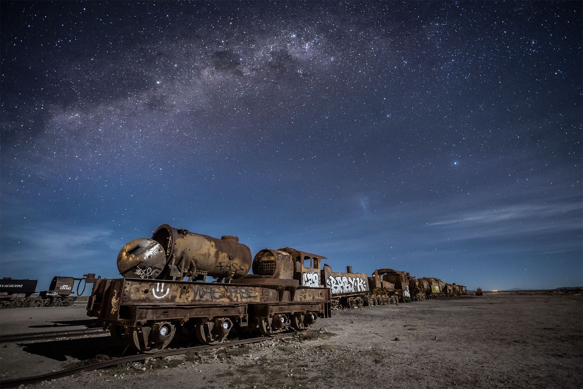 The ruins of the train graveyard in the Bolivian desert of Uyuni have not been used for many years. But the graffities and the spotlight of the moon give them a lot of attention. This single picture was captured with a 25 second long exposure at 12pm, while the moon had brightened up the foreground.