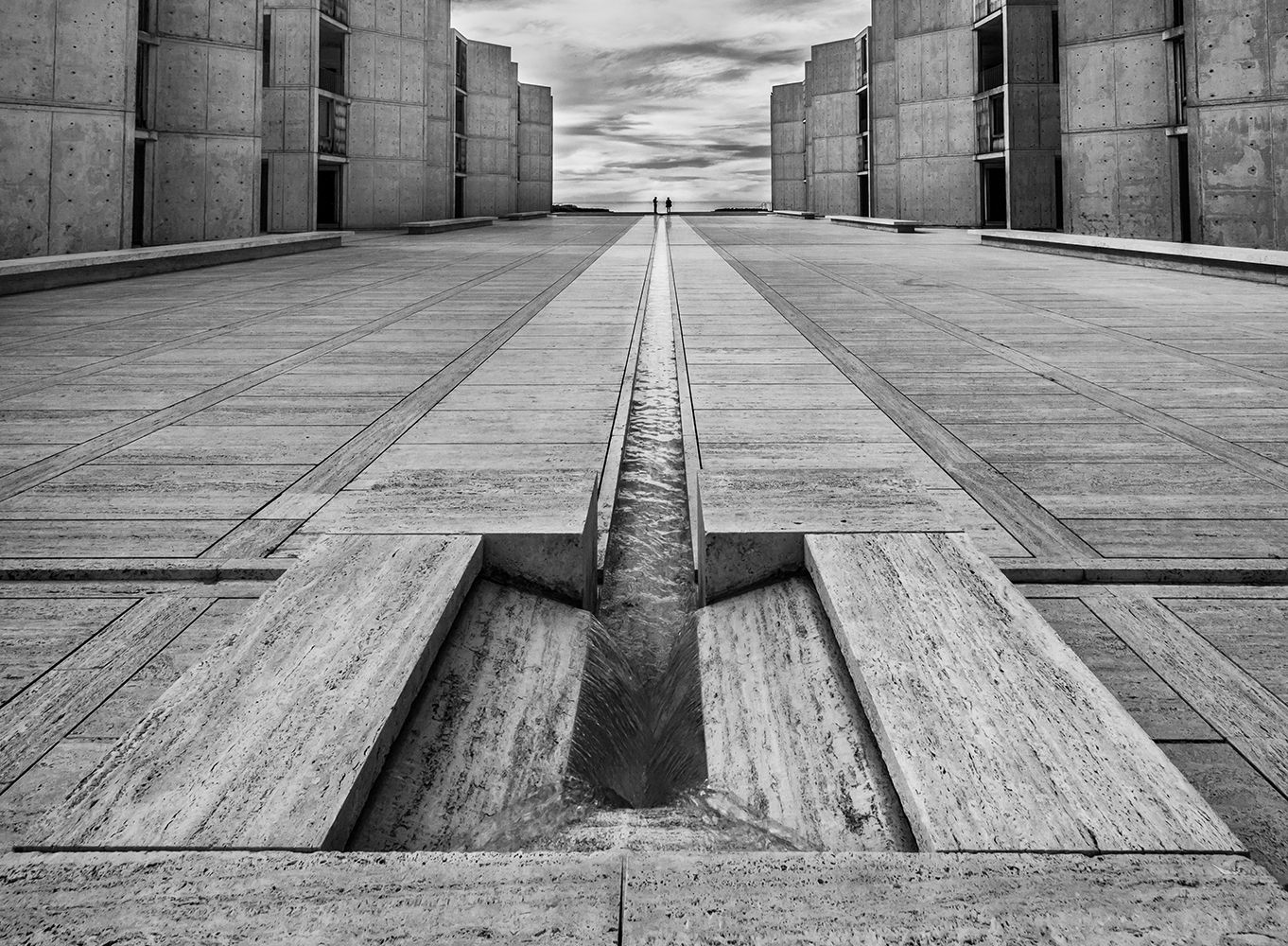 Leading line of water draws the eye to two people standing on either edge of the end of the line. Surrounding the two people is the architectural masterpiece that houses the Salk Institute in San Diego, California, USA