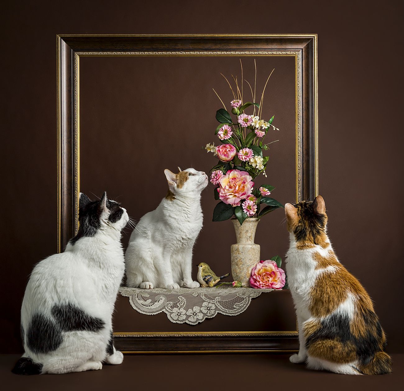 A concept of a frame within a picture where a cat in the frame is viewed by two other cats outside the frame creating a triangle of harmony.