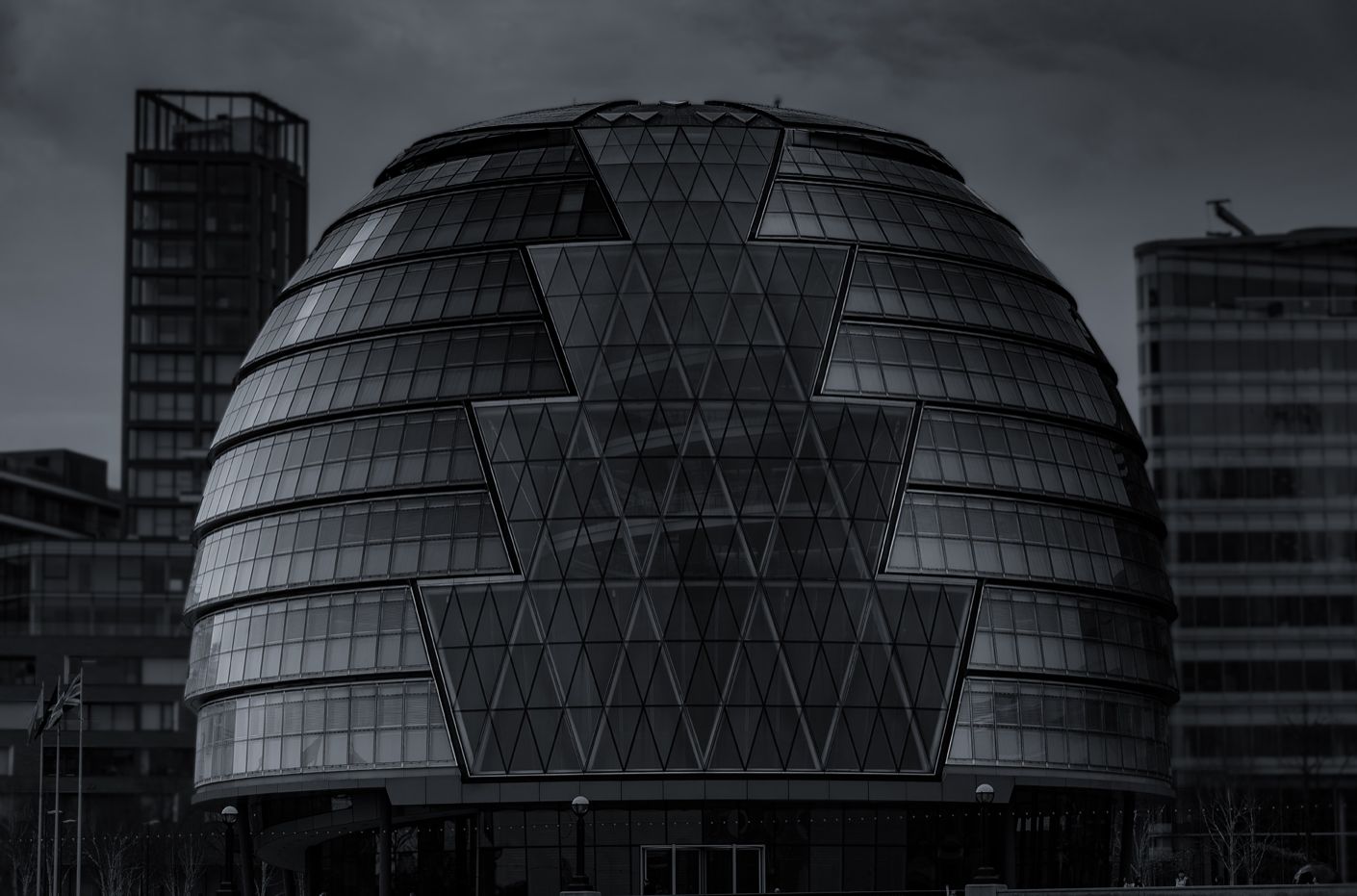 photo of the city hall of london, taken from a boat in movement by the river thamesis, the black and white image has been worked to highlight the detail of the architectonic work of the architect Norman Foster.