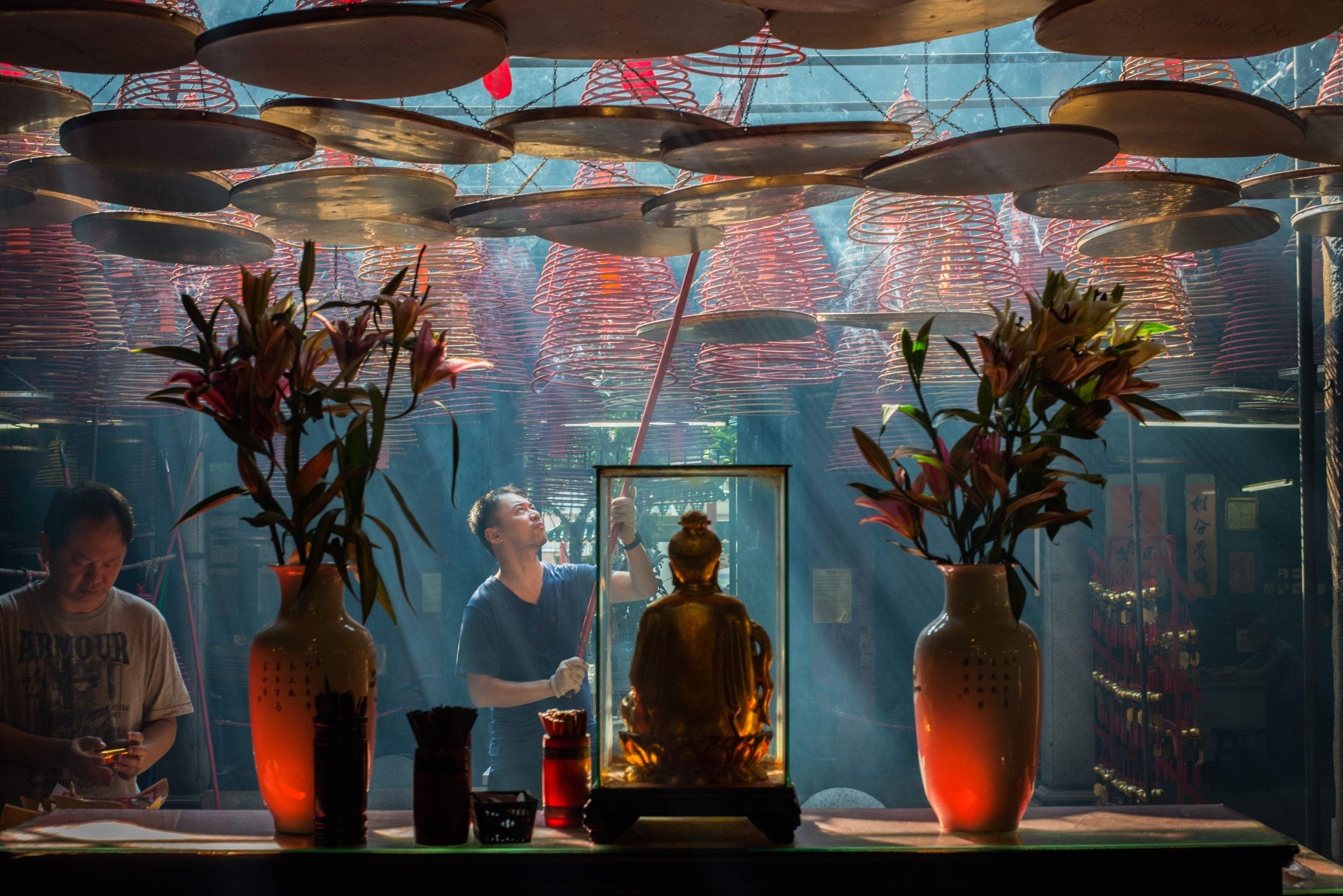 An attendant tends to the incense burning in the temple, removing the ashes. While a pilgrim quietly folds paper offerings. And the soothsayer quietly waits in the other corner. I'd like to think the goddess is watching and appreciating their piety.