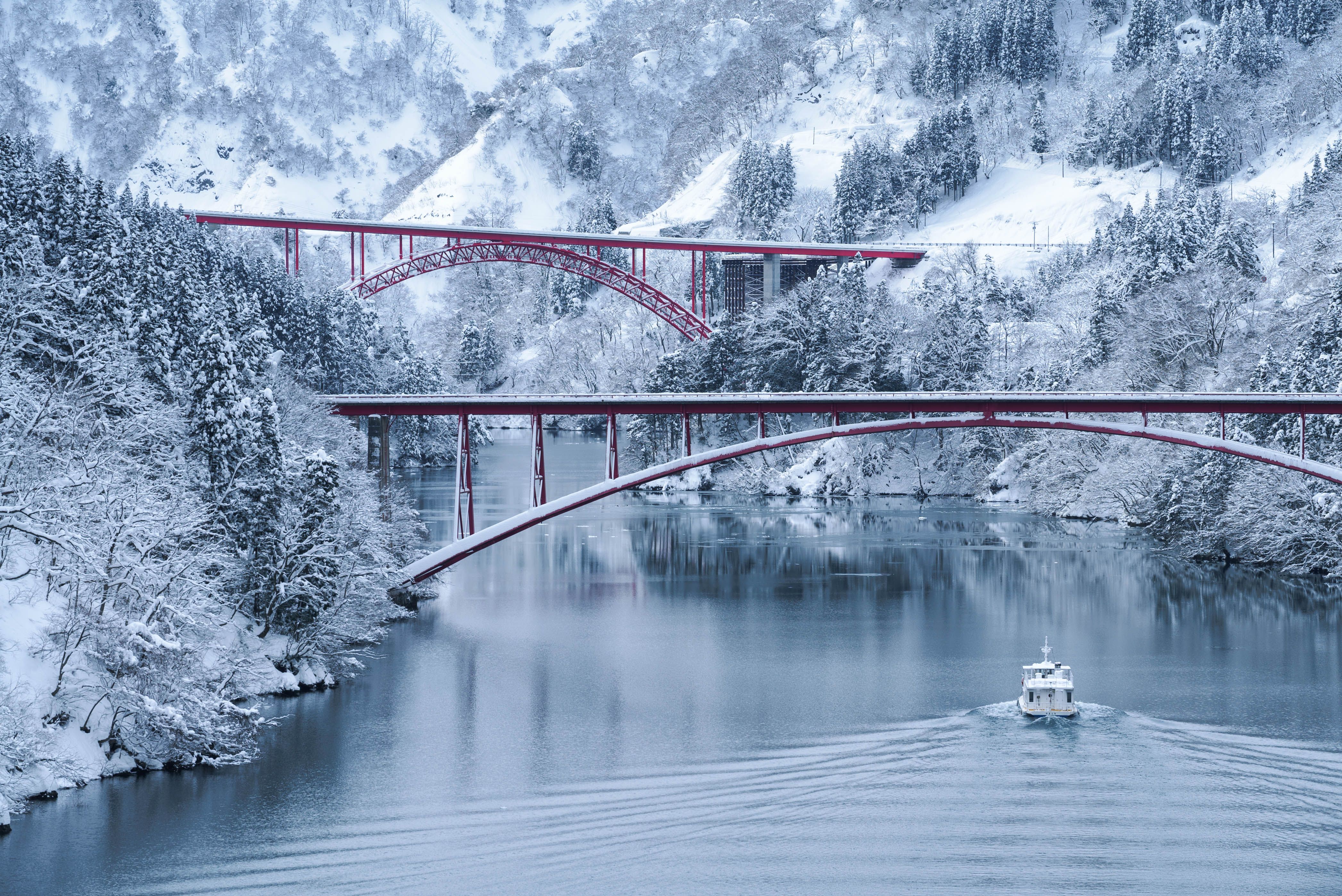 Photographed at Shogawa Gorges in Toyama Prefecture of Japan. This is the area where snow falls very well in Japan. I thought that I wanted to take a picture of the regular boating boat passing under the bridge over the valley. I did not use a tripod for this work, I took a handheld at 200 mm telephoto. Very hand was cold, but by doing so the composition of the pleasure boat and the bridge was completed with compression effect. It was a very attractive place to make me want to go shooting again.