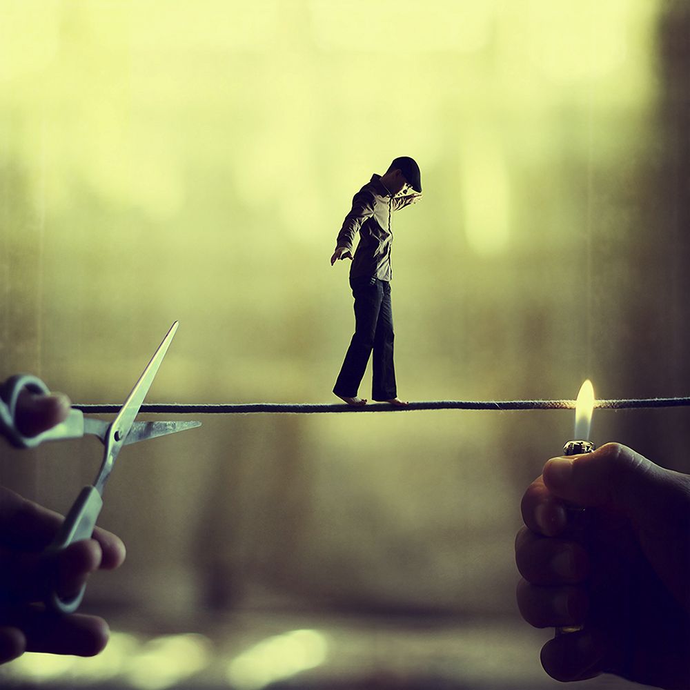 This digital photograph is characteristic of my surreal art. Here, a miniature man appears walking along a tightrope, a pair of scissors and a thread about to cut or burn through the cord.