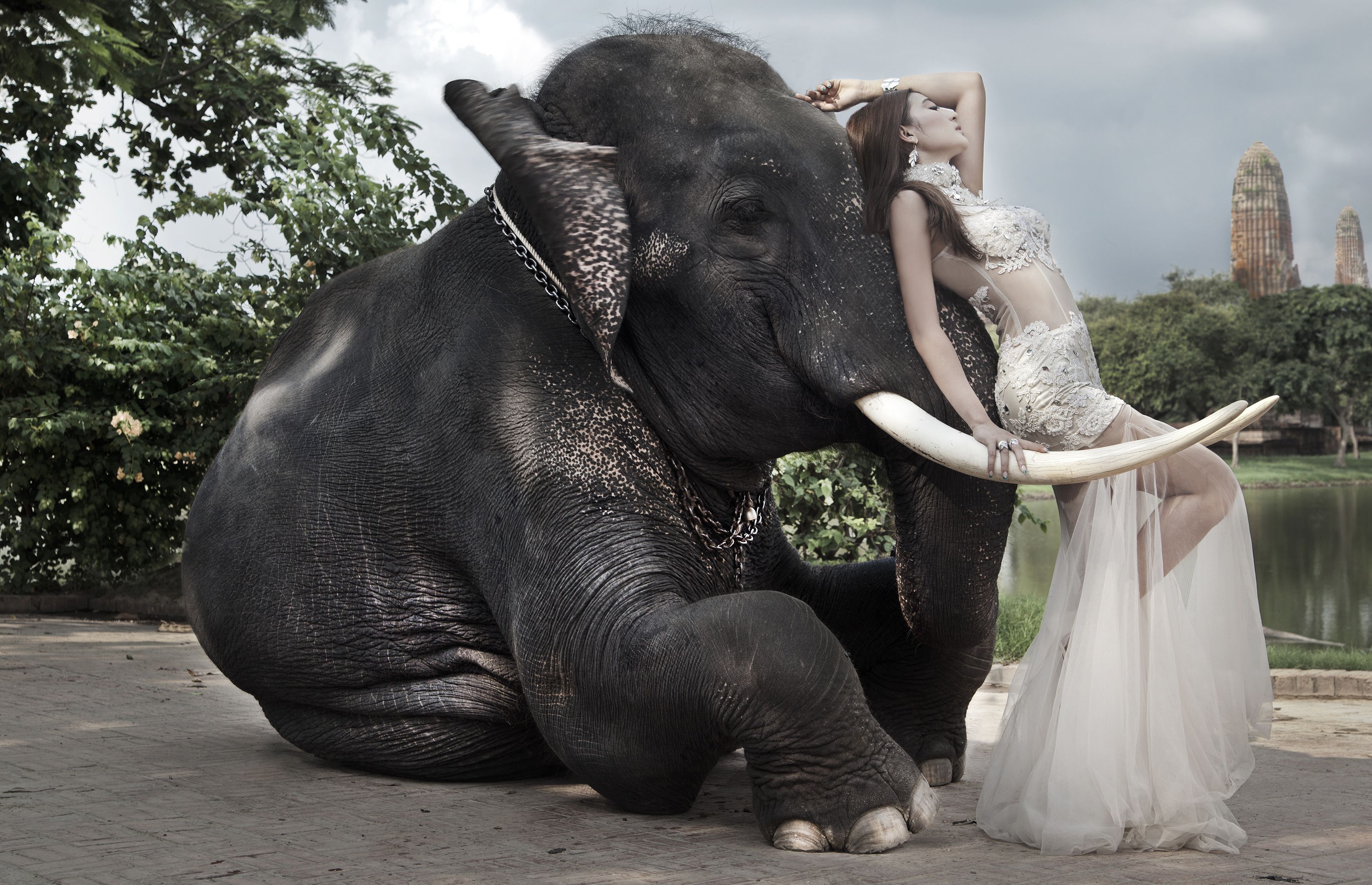 A tribute to Richard Avedon with a modern twist. In Thailand, elephants are considered sacred creatures. Couture fit for royalty married with the magnificent beast to showcase grace and sophistication.
